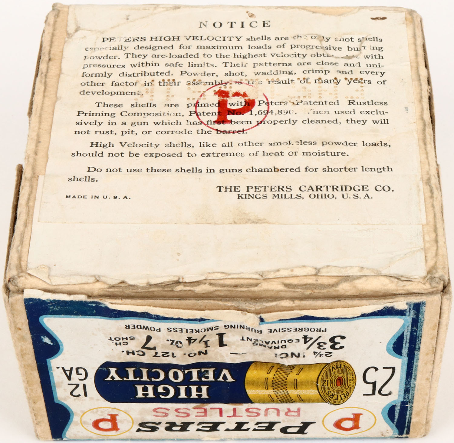 Peters Cart. Co., Blue Bill, 12ga., 2pc., Empty, shot size 7CH shot, buff box with multi colored label that pictures Blue Bill in flight, box has scuffing, light soiling & box is solid with very good colors. Grade: Very Good ++ - Value: 50 to 200