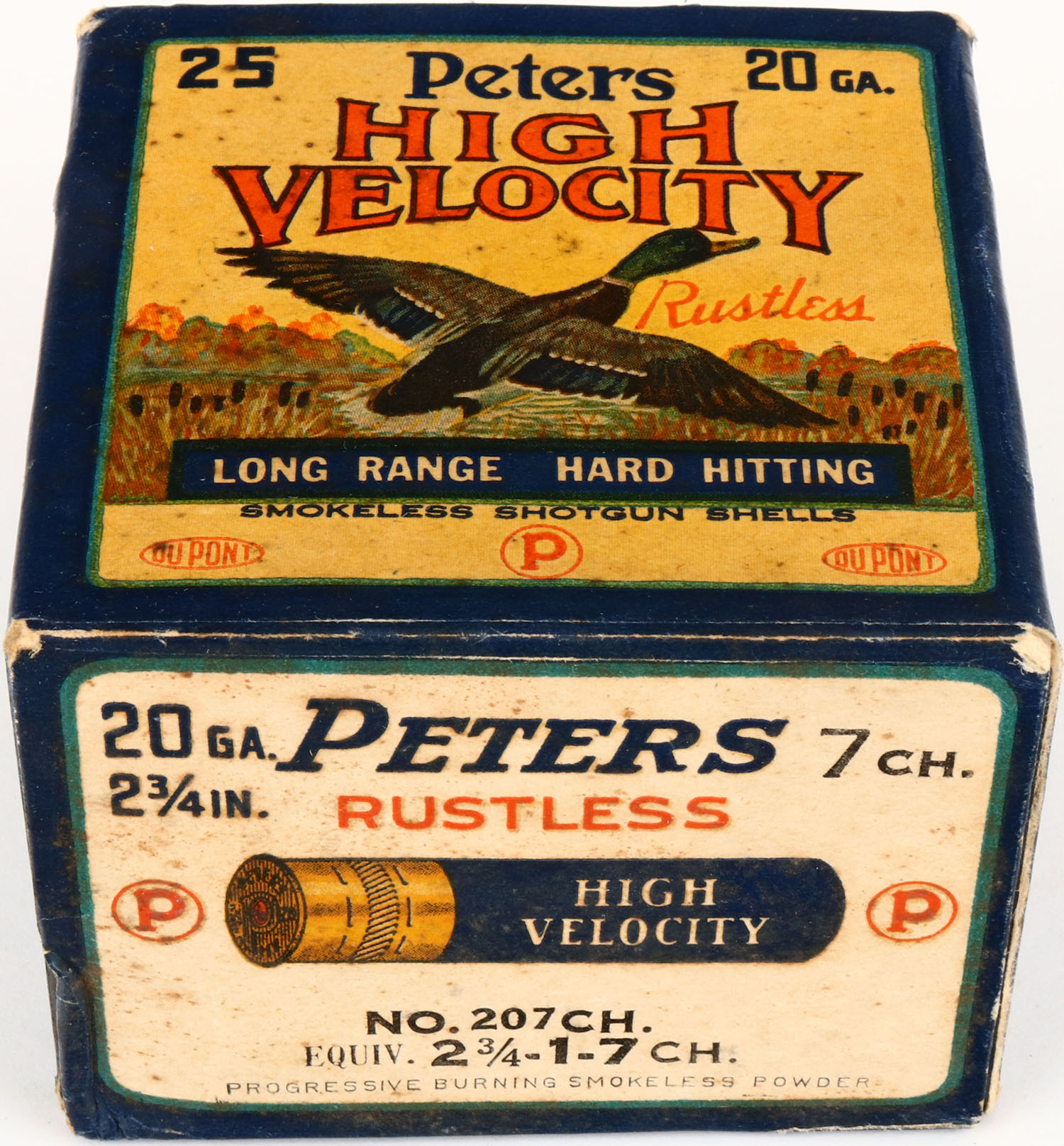 Peters Cart. Co., Kings Mills, OH, High Velocity, 20ga., 1pc., Full., shot size 7CH, multi colored box that pictures mallard flying out of the marsh grass, box is very solid with nice colors, Shells are good. Grade: Excellent - Value: 20 to 100