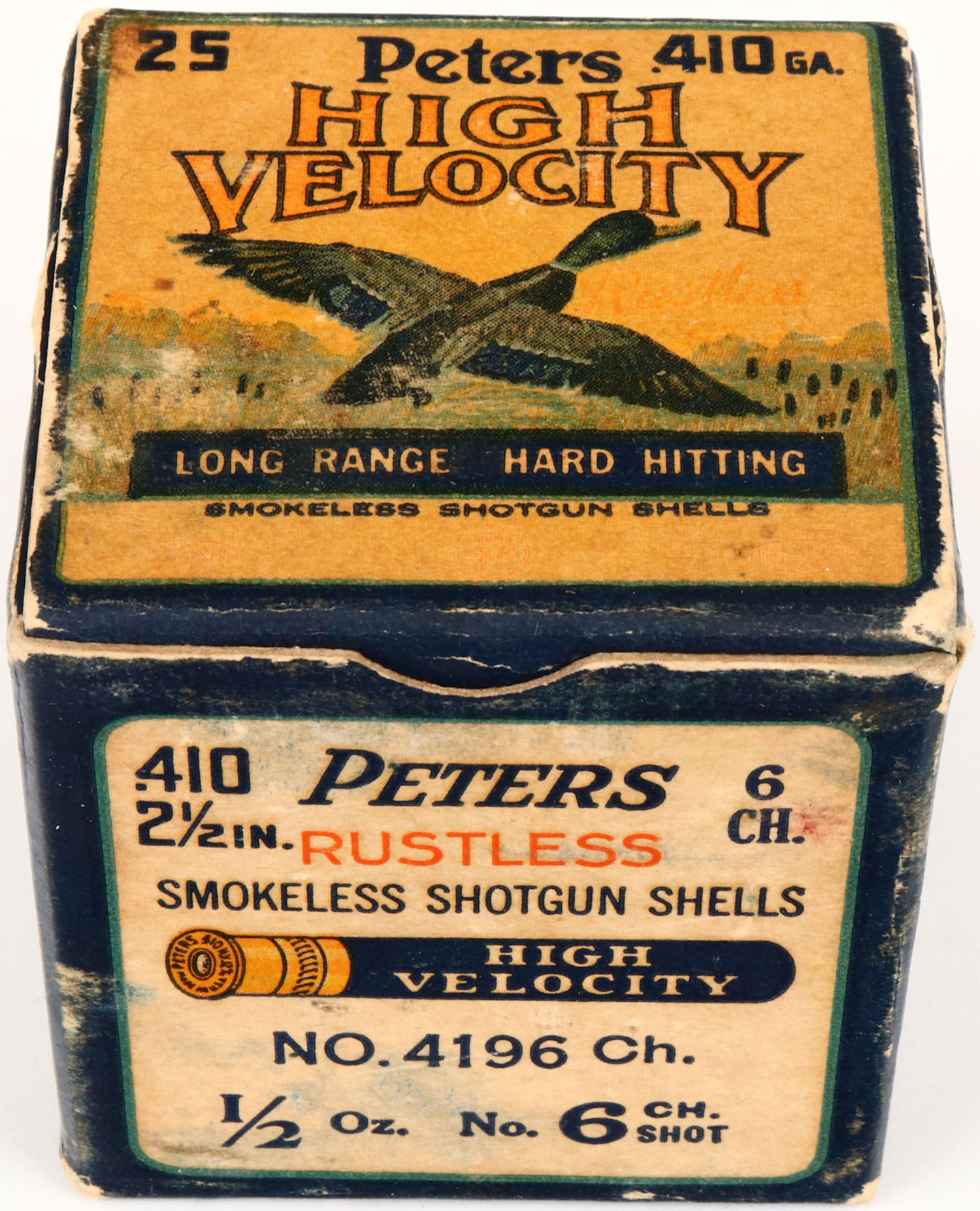 Peters, High Velocity, 410ga., 2 1/2 in., 1pc., Full, shot size 6CH, multi-colored box with mallard duck flying out of marsh grass, box is solid with age soiling, light edge wear, shells are excellent. Grade: Very Good + - Value: 20 to 100