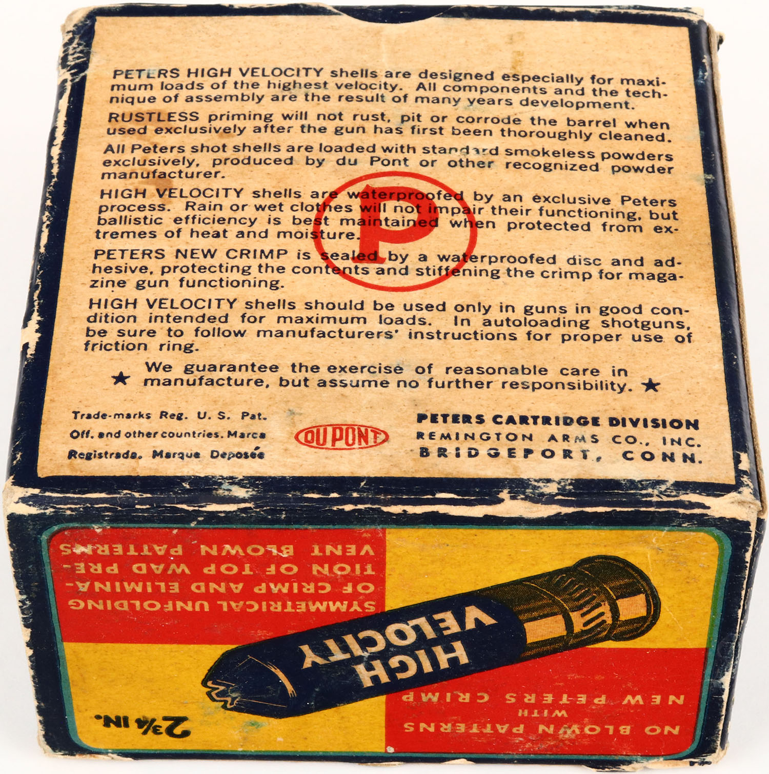 Peters Cart. Co., High Velocity, New Peters Crimp, 12ga., 1pc., Full, shot size 6, multi colored box that pictures mallard flying out of the marsh grass, paper shells, box is very solid with very nice colors & light edge wear, shells are very good. Grade: Very Good ++ - Value: 10 to 40