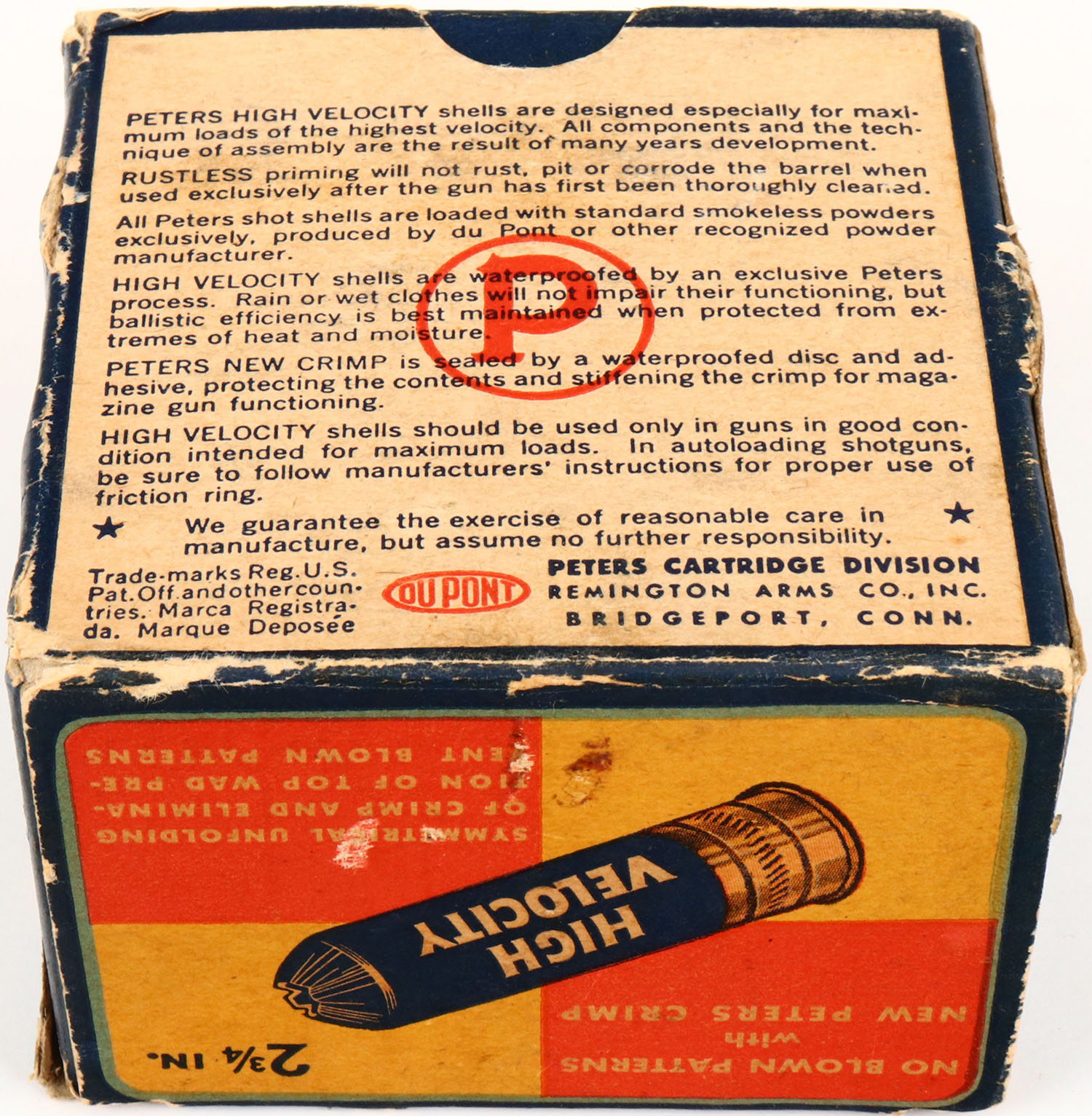 Peters Cart. Co., High Velocity, New Peters Crimp, 20ga., 1pc., Full, shot size 4, multi colored box that pictures mallard flying out of the marsh grass, paper shells, box has shell protrusions, edge wear, & has a seam split with nice colors, Shells are very good. Grade: Very Good ++ - Value: 20 to 50