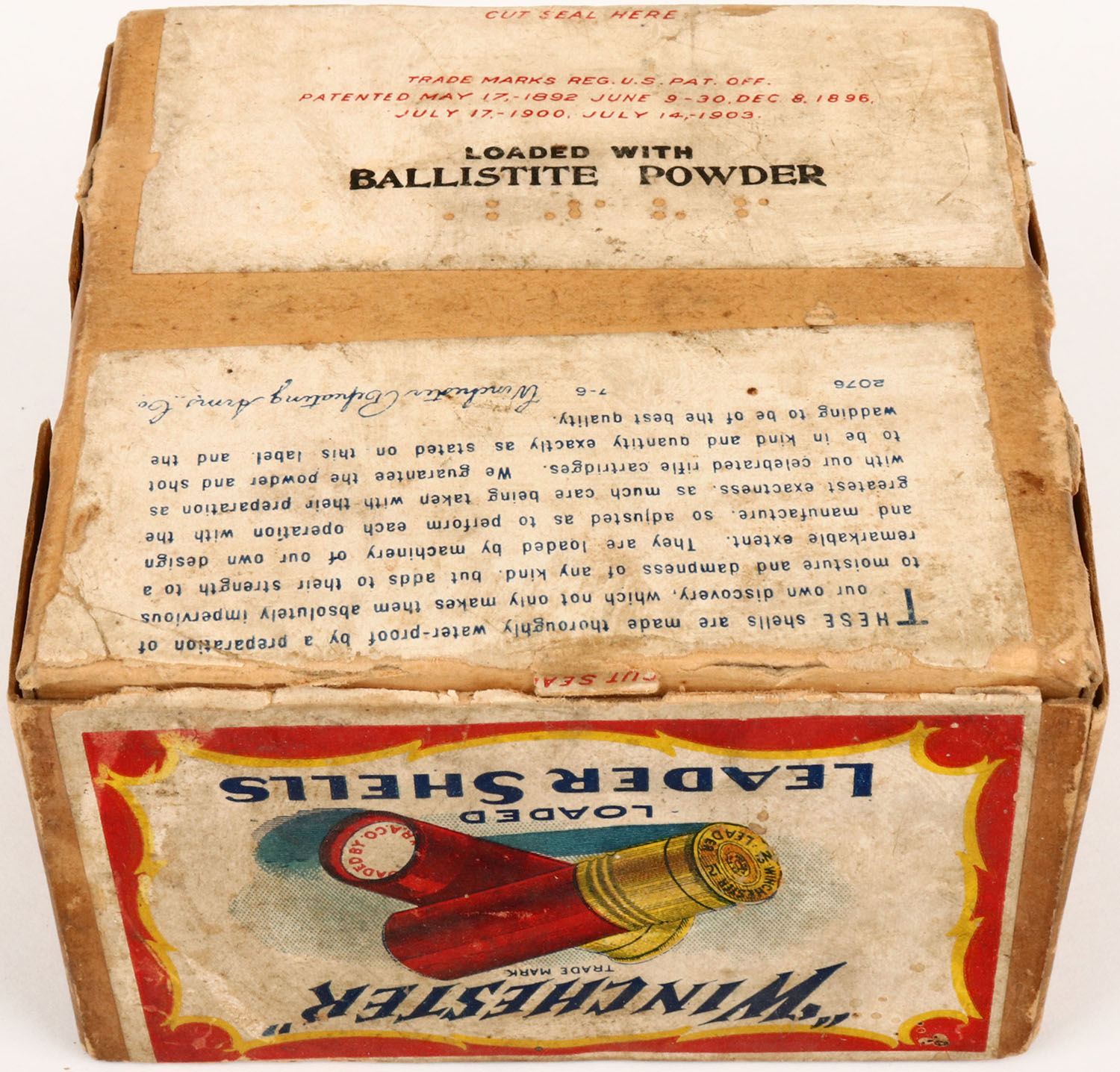 Winchester, LEADER, 12ga, 2pc., FULL, shot size BB, Buff box with red, yellow, white & black label showing lightning bolt, box is very solid with light age soiling, great color to label, Shells are excellent. Grade: Excellent - Value: 100 to 400