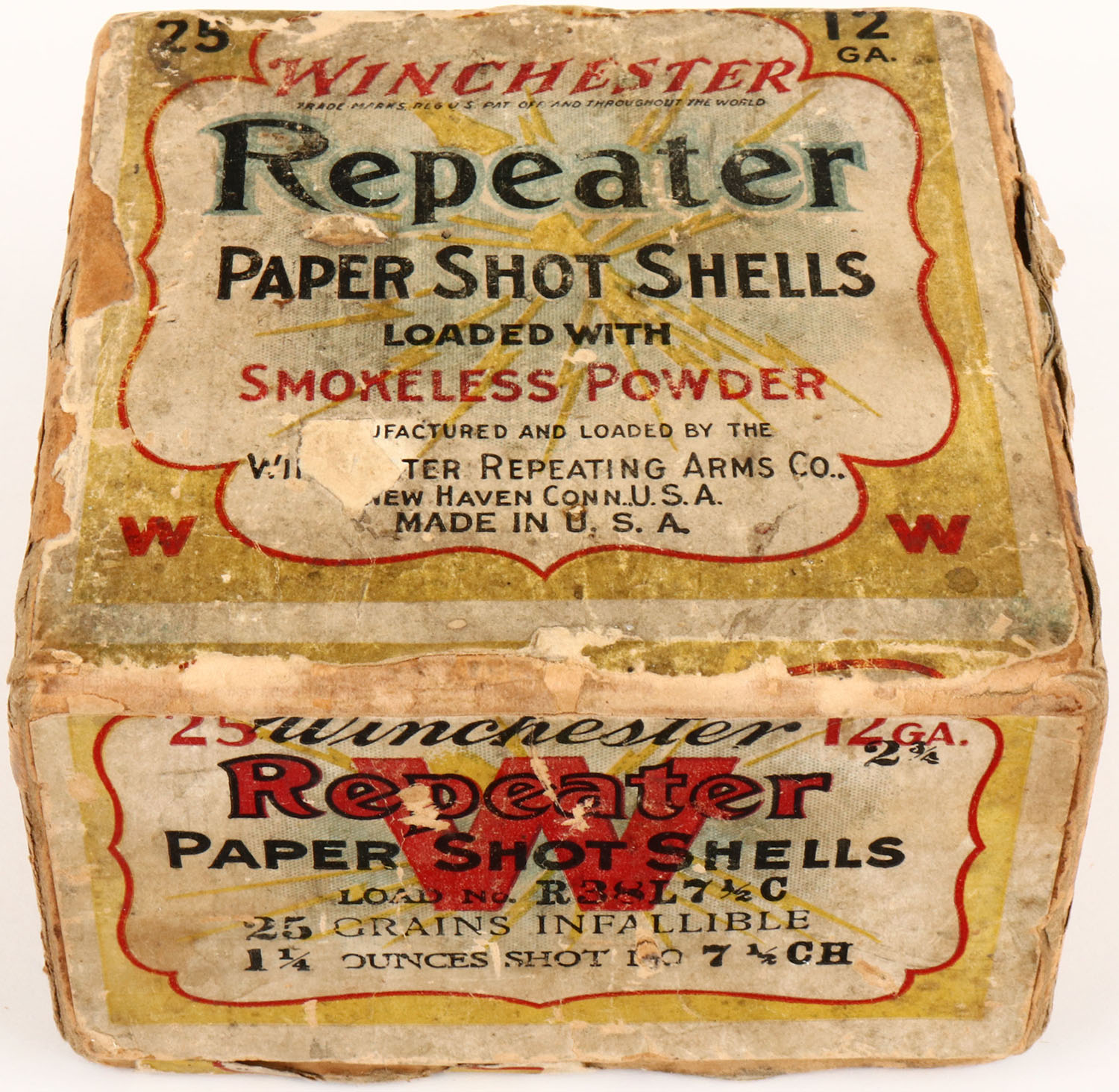 Winchester, REPEATER, 12 Gauge, 2pc., FULL, Shot Size 7 1/2, Buff box with yellow, white & red label showing lightning bolt, box has seam splits, age soiling, and shell protrusions. Shells are excellent. Grade: Very Good + - Value: 50 to 200