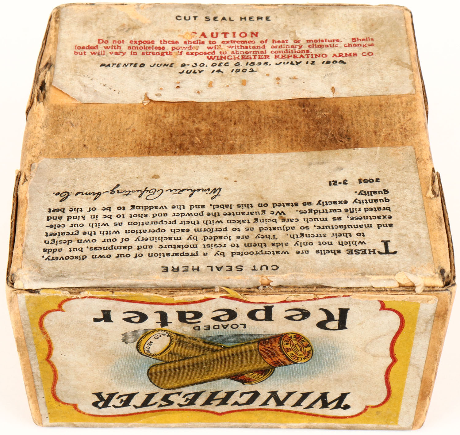 Winchester, REPEATER, 12 Gauge, 2pc., Empty., Shot Size 6, Buff box with yellow, white & red label showing lightning bolt, box is solid with small shell protrusion, light age soiling and nice label. Grade: Very Good ++ - Value: 50 to 200