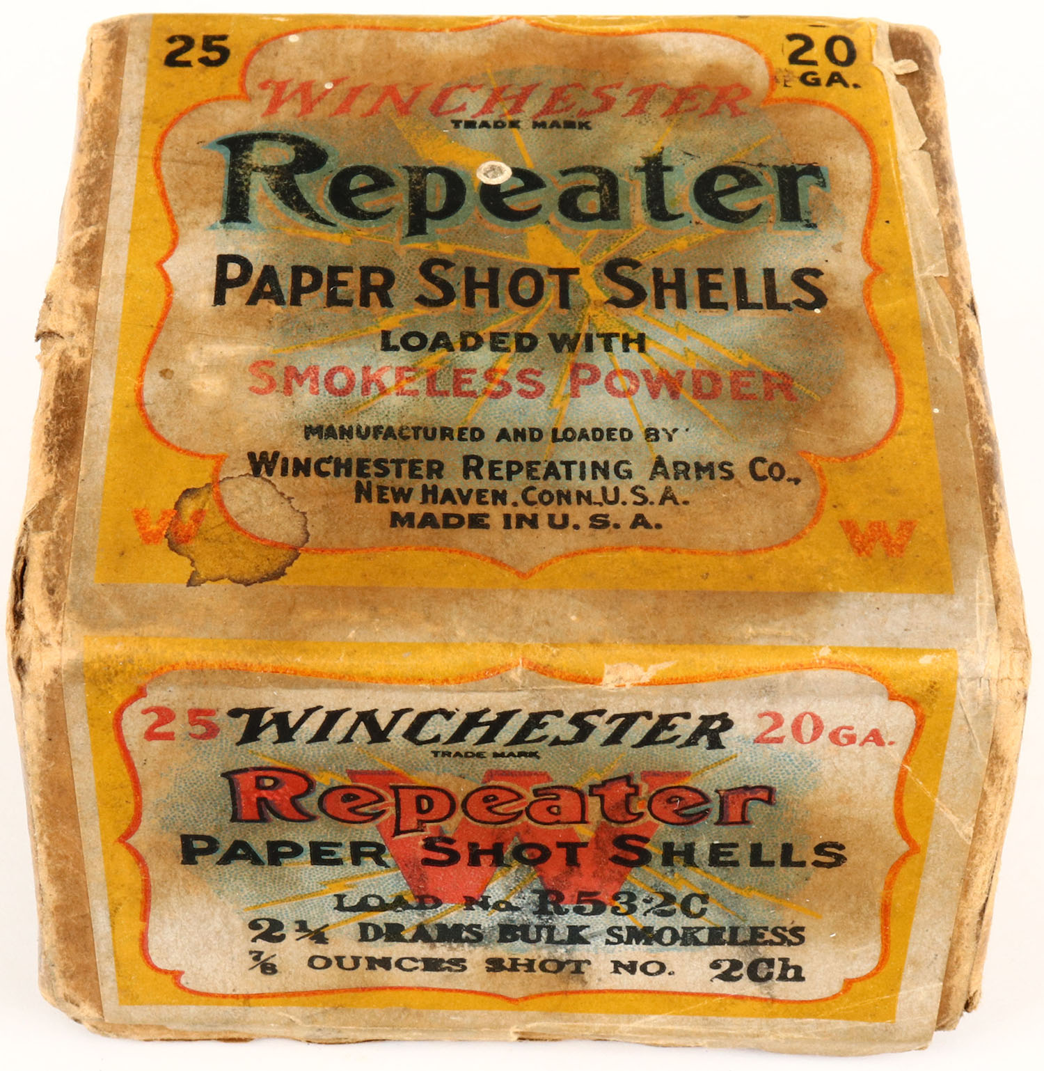 Winchester, REPEATER, 20 Gauge, 2pc., Full, Shot Size 2 Ch, Buff box with yellow, white & red label showing lightning bolt, box is solid with shell protrusions, and age soiling, Shells are excellent. Grade: Very Good - Value: 50 to 200