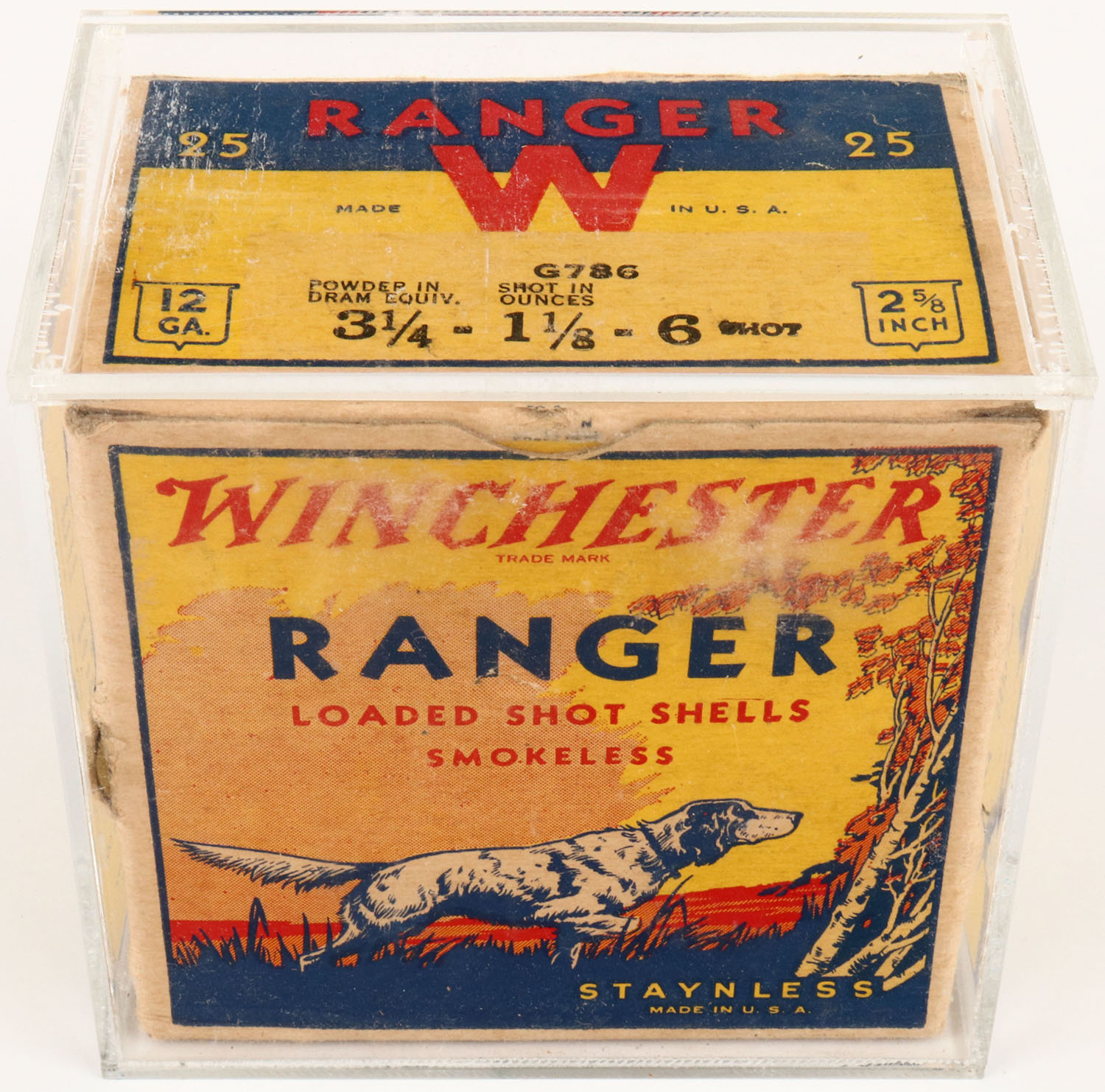 Winchester, Ranger with nice Display Acrylic Box, 12 Gauge, 1pc., Full, Shot Size 6, multi colored box, dog on point, shells 2 5/8'', box has shell protrusion with great colors, shells are very good. Grade: Excellent + - Value: 40 to 100