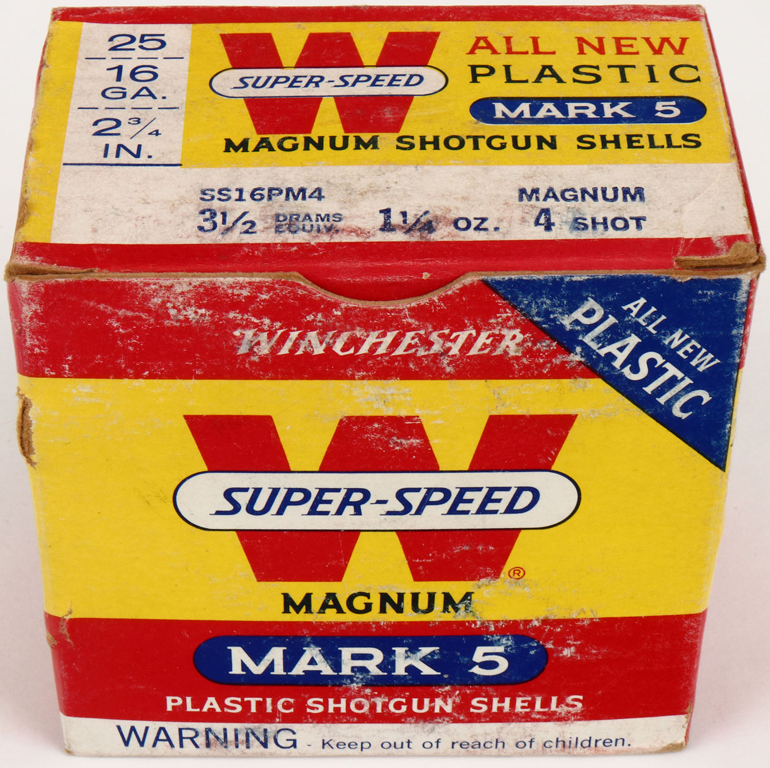Winchester, Super Speed Mark 5, 16 ga., 2 3/4'', 1pc., Full, shot size 4 Magnum, yellow, blue & red box, box is solid with light soiling and light shell protrusion, shells are excellent. Grade: Excellent + - Value: 10 to 30