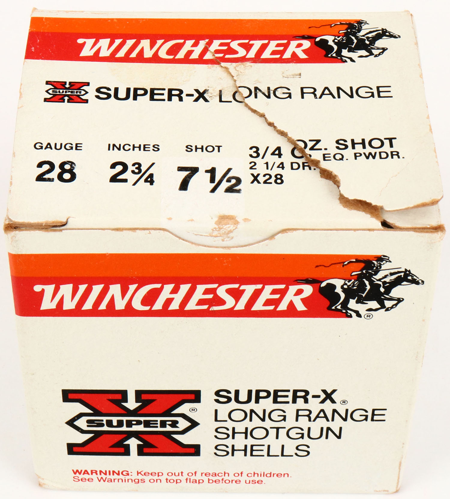 Winchester, Super-X, 28ga., 1pc., Full., 2 3/4'', shot size 7 1/2, multi colored box with tear on top, box has very nice colors, shells are very good. Grade: Excellent - Value: 10 to 30