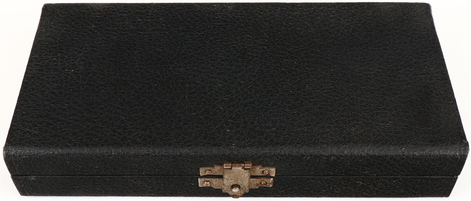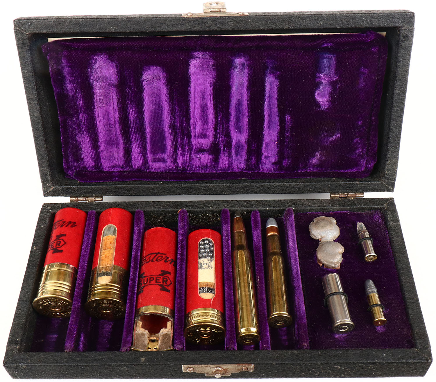 Western Salesman Sample Mixed Ammo, 3 Window shells & 1 cut away shells, shells inside are excellent, 5 rifle/pistol rounds 2 bullets being fired, box is black leather, box is solid with excellent colors on the inside. Grade: Excellent + - Value: 200 to 800