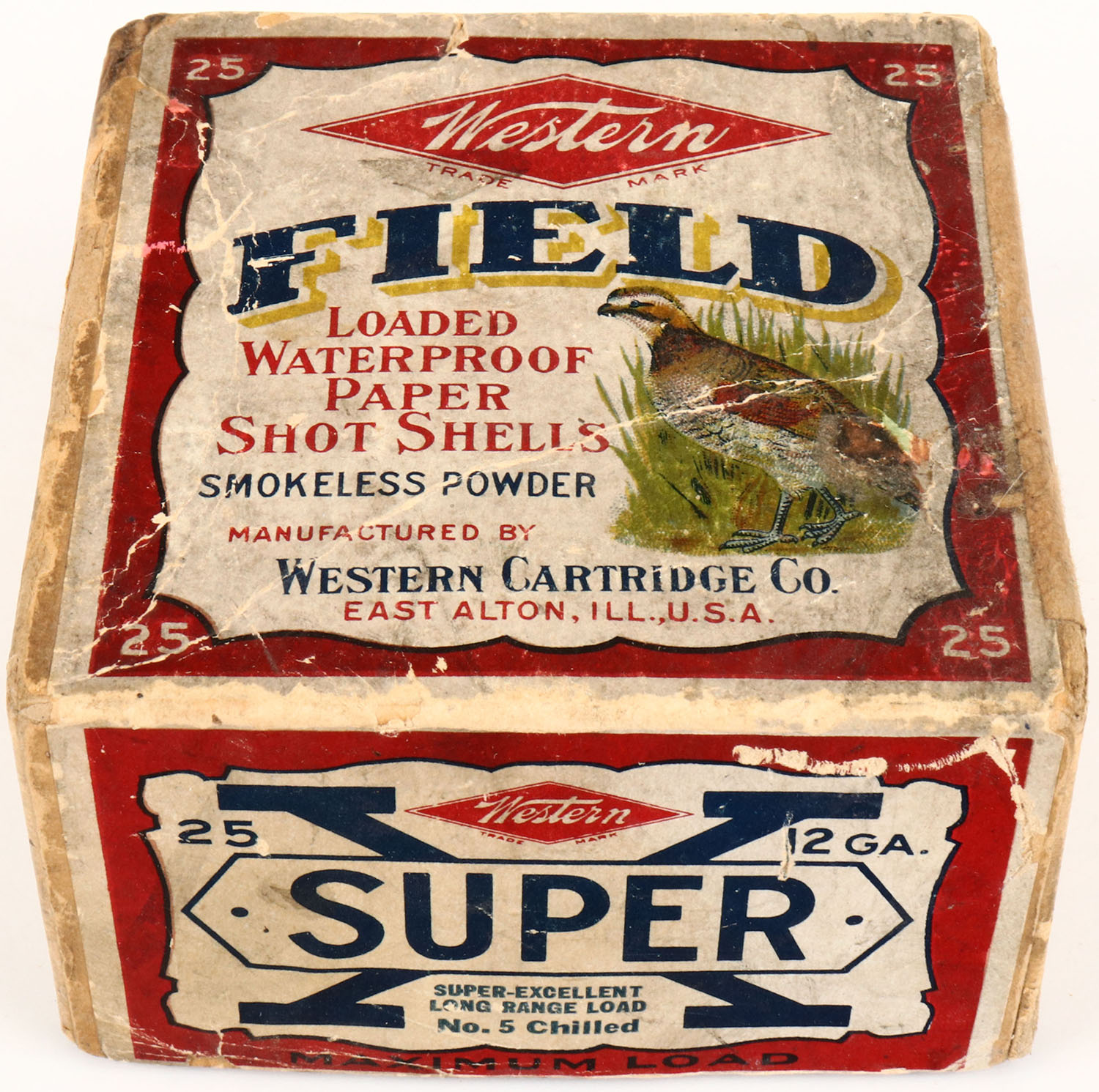 Western, Field/Super X, Label was made during transition from Field boxes to Super X boxes. 16ga., 2pc, Empty, shot size 5 Chilled, box has light age soiling, scuffing & tape repair with good label. Grade: Very Good ++ - Value: 50 to 150