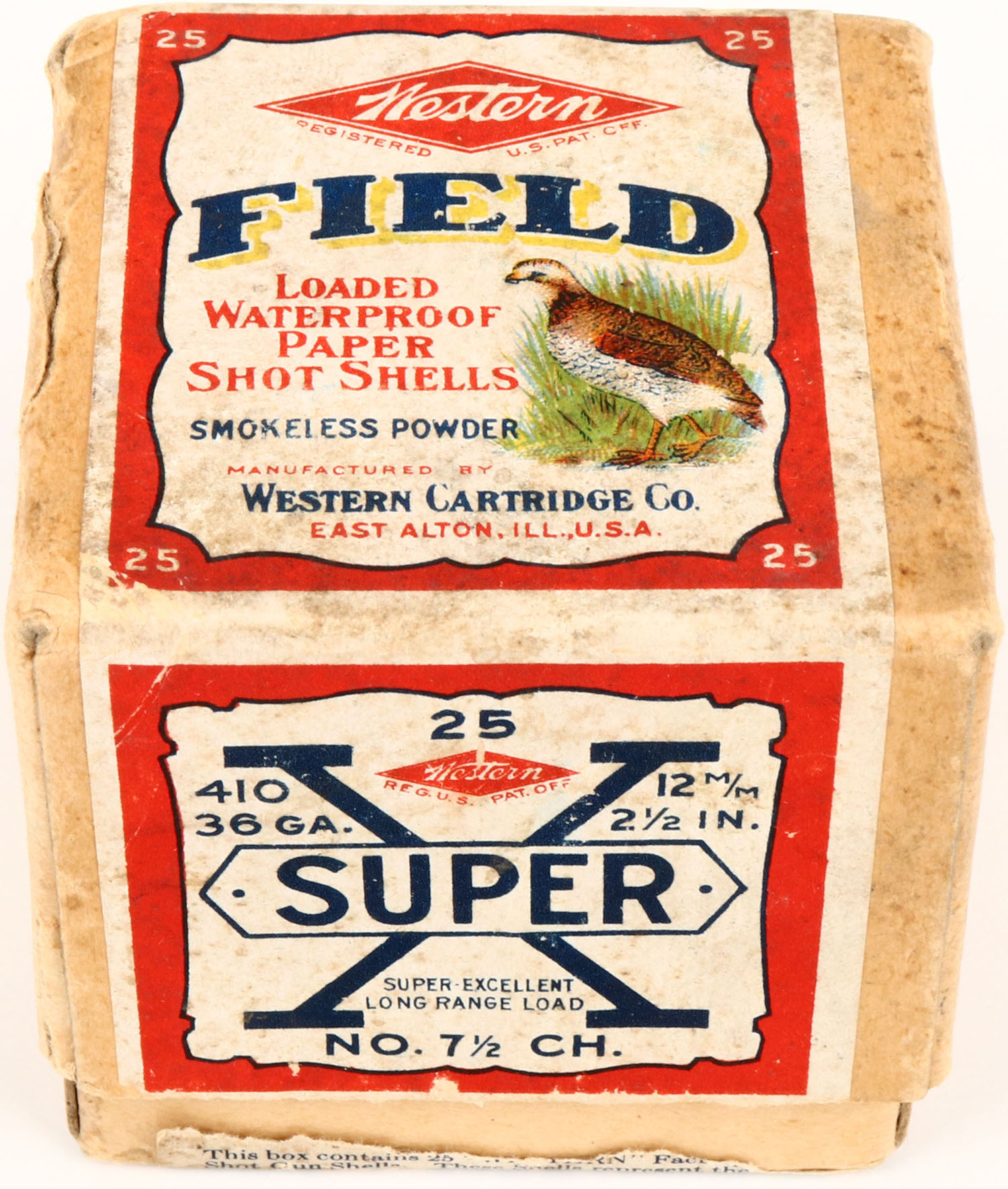 Western, Field/Super X, Label was made during transition from Field boxes to Super X boxes. 410ga., 2pc, Full, shot size 7 1/2 CH, box has seam split with age soiling. Grade: Excellent - Value: 100 to 300