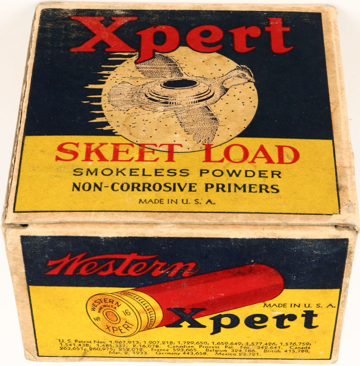 Western Xpert, SKEET LOAD with two inserts, 16ga., 1pc., Partial 22rds, white, blue & red box that pictures flying Quail with skeet in body & shot all around, Loading: 2 1/2 Drams 1 Oz. No. 9 Chilled Shot, box is solid with light scuffing to top & inside flap has part torn off and very nice colors, shells are excellent. Grade: Excellent + - Value: 100 to 300