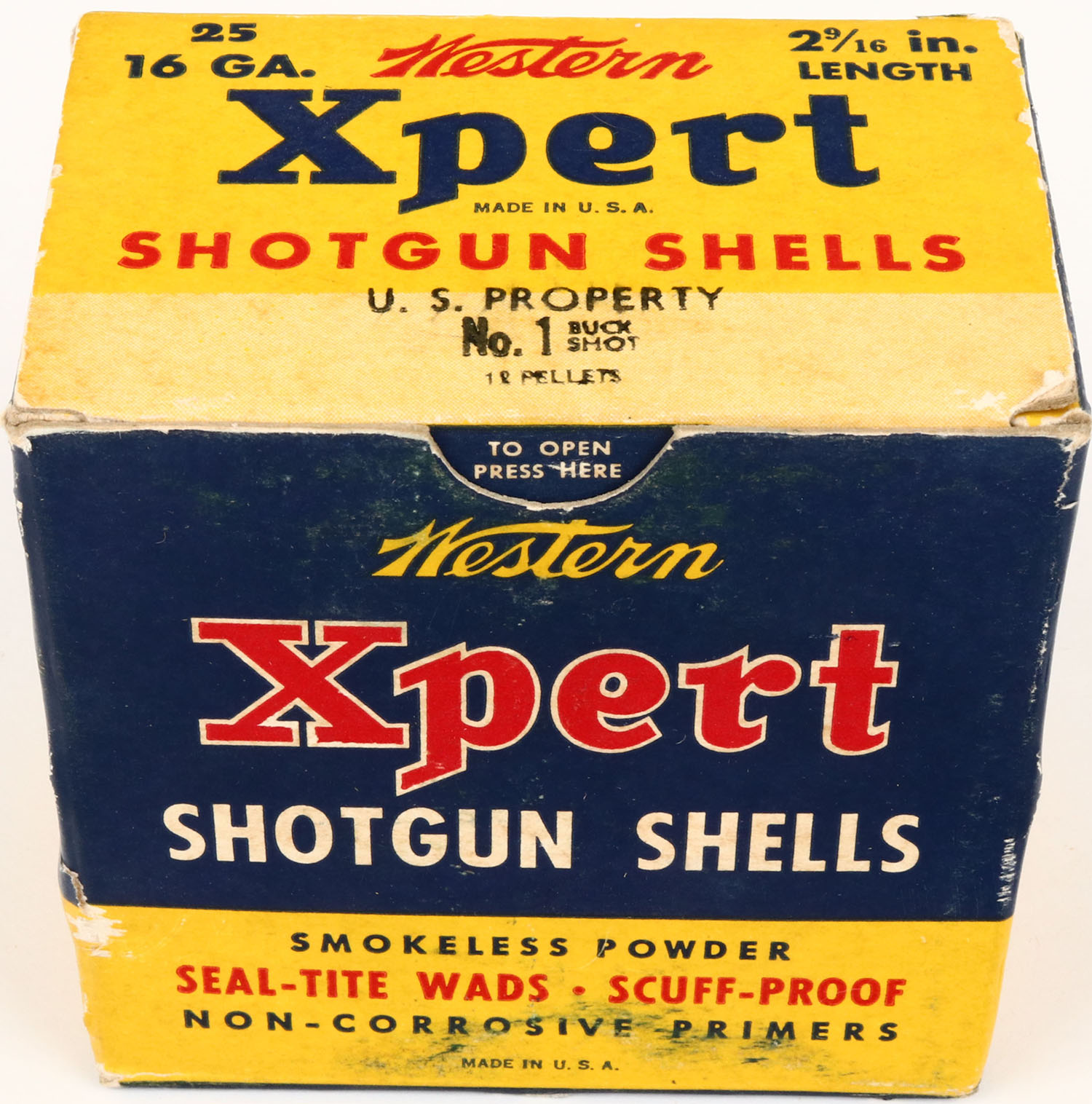 Western, Xpert, 16ga., 2 9/16'', 1pc., Full of Record 1 Buck, shot size 1 Buckshot, yellow, blue & red box, box is solid with light soiling, shell protrusions, and great colors, shells are excellent. Grade: Excellent - Value: 10 to 30