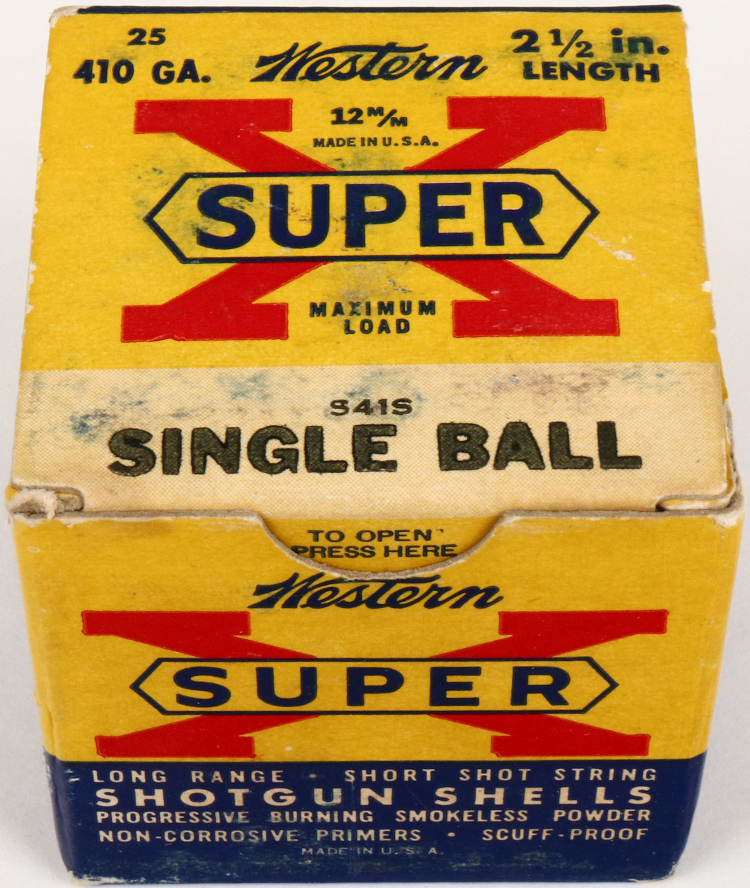Western, Super X, 410ga., 2 1/2'', Single Ball, 1pc., Full, yellow, blue & red box, box is solid with age soiling and part of flap is missing but nice color, shells are very good. Grade: Very Good + - Value: 18 to 40