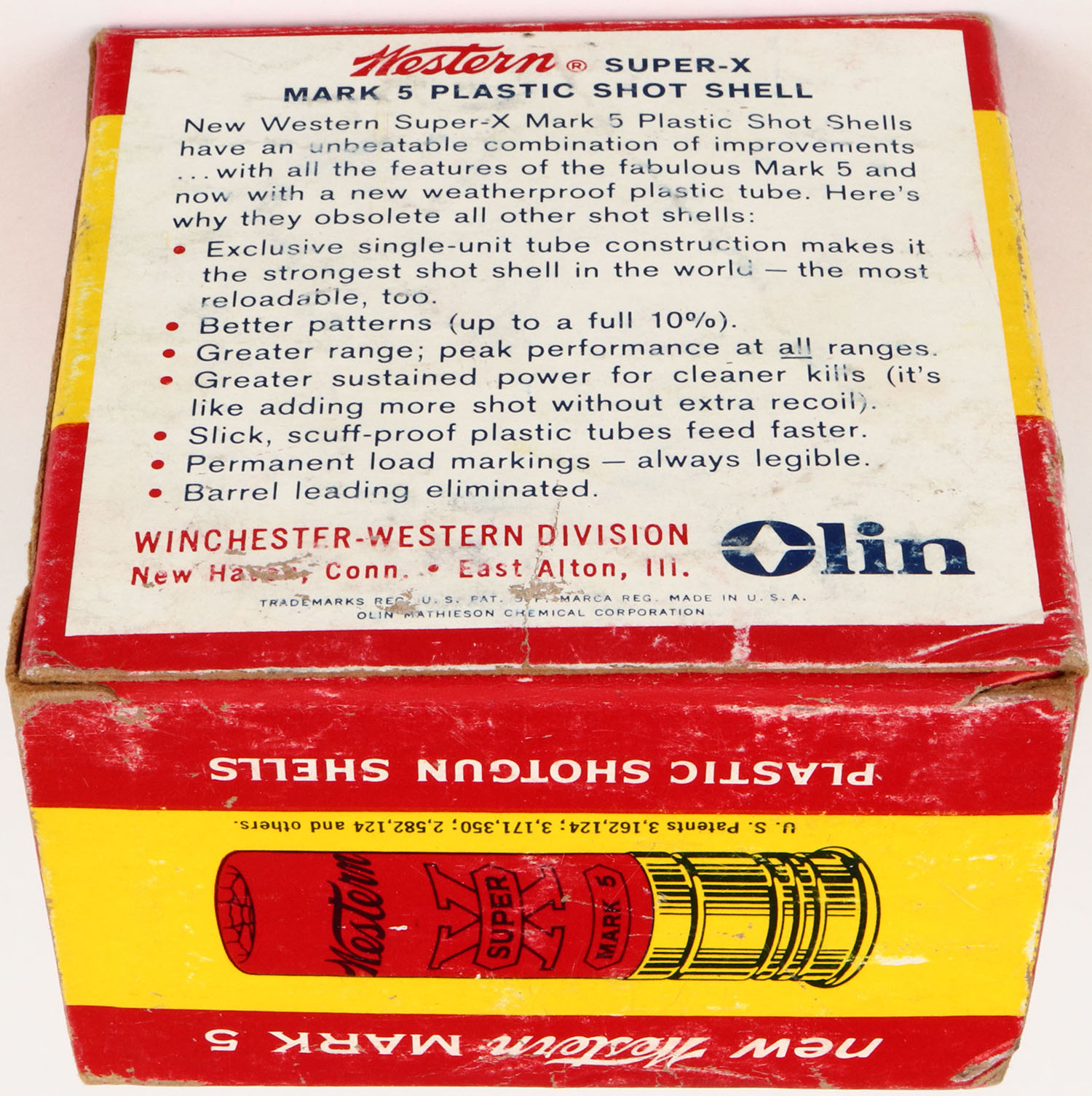 Western, Super X Mark 5, 16 ga., 2 3/4'', 1pc., Full, shot size 6, yellow, blue & red box, box is solid with scuffing, shells are very good. Grade: Very Good ++ - Value: 10 to 30