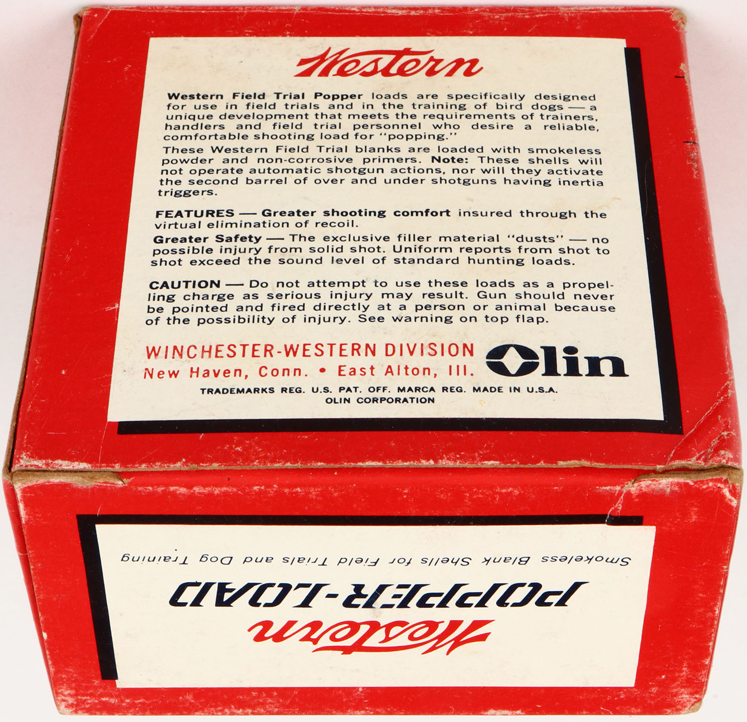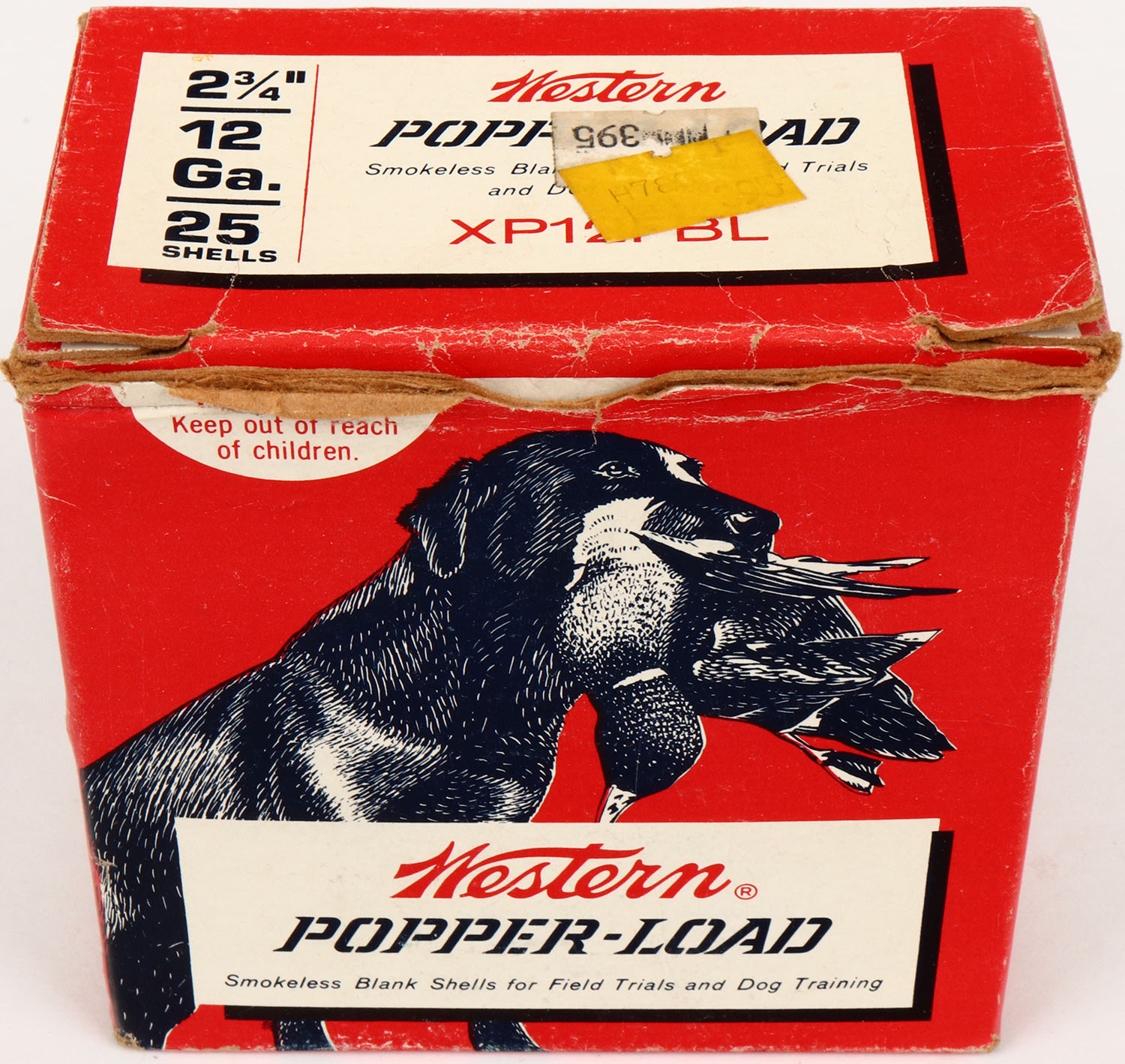 Western, POPPER-LOAD, 12ga., 1pc., Full, red, white & blue box, made for training dogs, nice box. Grade: Very Good + - Value: 20 to 40
