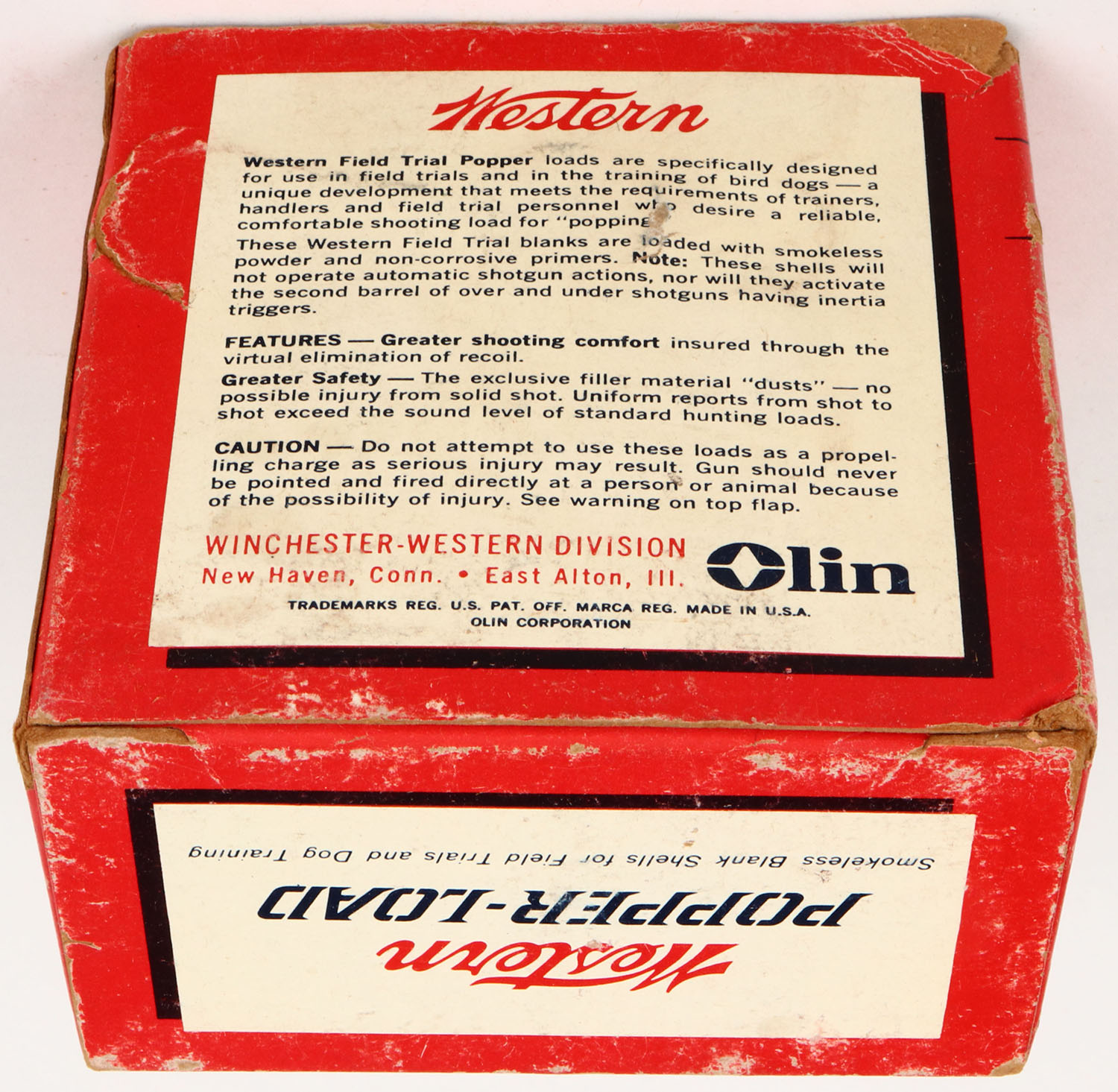 Western, POPPER-LOAD, 12ga., 1pc., Full, red, white & blue box, made for training dogs, nice box with top flap disconnected. Grade: Very Good ++ - Value: 20 to 50