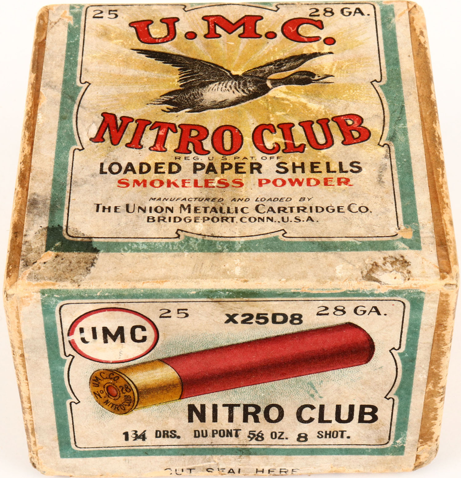 U.M.C. Nitro Club, 28 GAUGE, 2pc., Partial 19rds with one being incorrect shot size, shot size 8, buff box with sunburst logo & Mallard flying on top, bottom piece of box is almost disconnected, has light age soiling with tape repairs and very good color to label. Grade: Very Good ++ - Value: 70 to 250
