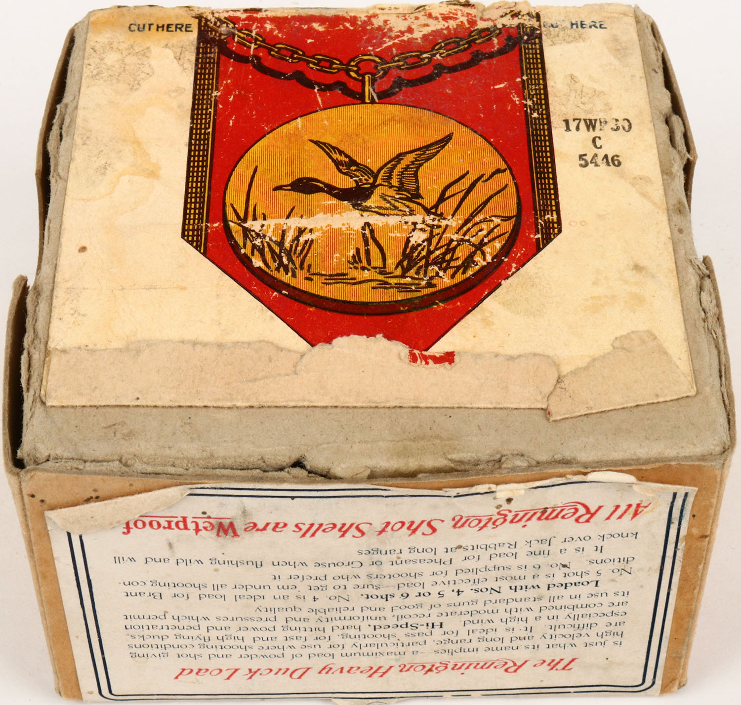 Remington Nitro Club, Game Load, 12ga., 2pc., Empty, shot size 4CH, buff box with sunburst logo & Mallard in flight on side, box has shell protrusions, seam split, and light age soiling, bottom box is incorrect. Grade: Excellent - Value: 50 to 100