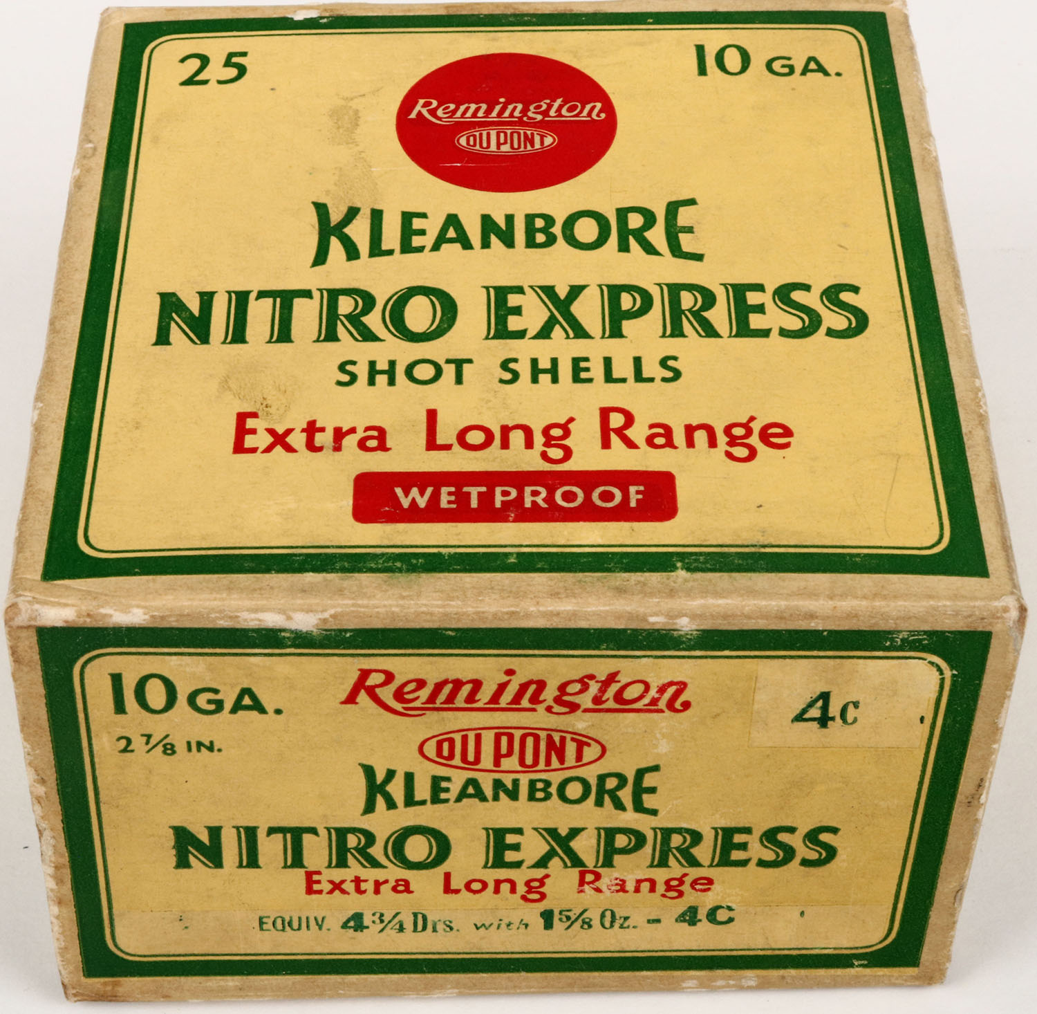 Remington, Kleanbore, NITRO EXPRESS, 10ga., 1pc., Full, shot size 4C, box is yellow, red and green, box is solid, has light soiling with very nice colors, shells are excellent. Grade: Excellent + - Value: 20 to 80