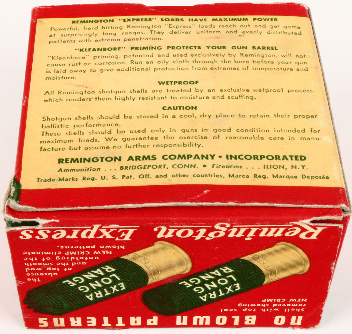 Remington, Express Extra Long Range, 12ga., 2 3/4'', 1pc., Full with six being incorrect shot size, shot size 7 1/2, box is red, white and green, box is very solid with great colors and light edge wear, shells are excellent. Grade: Excellent + - Value: 10 to 30