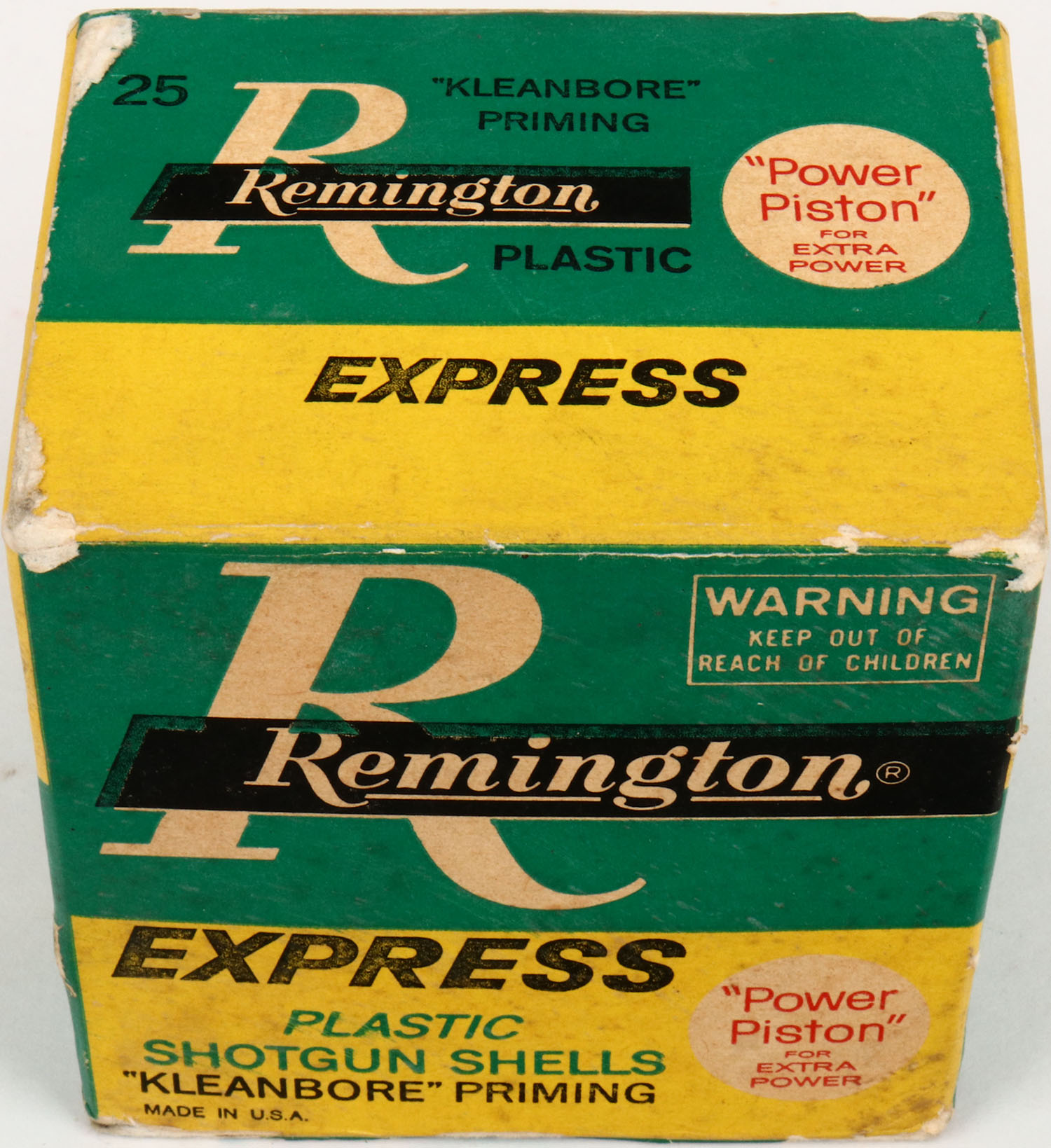 Remington, Express, 28ga., 2 3/4'', 1pc., Full, shot size 6, green, yellow & white box, box has good color with light age soiling, shells are very good. Grade: Very Good + - Value: 8 to 20