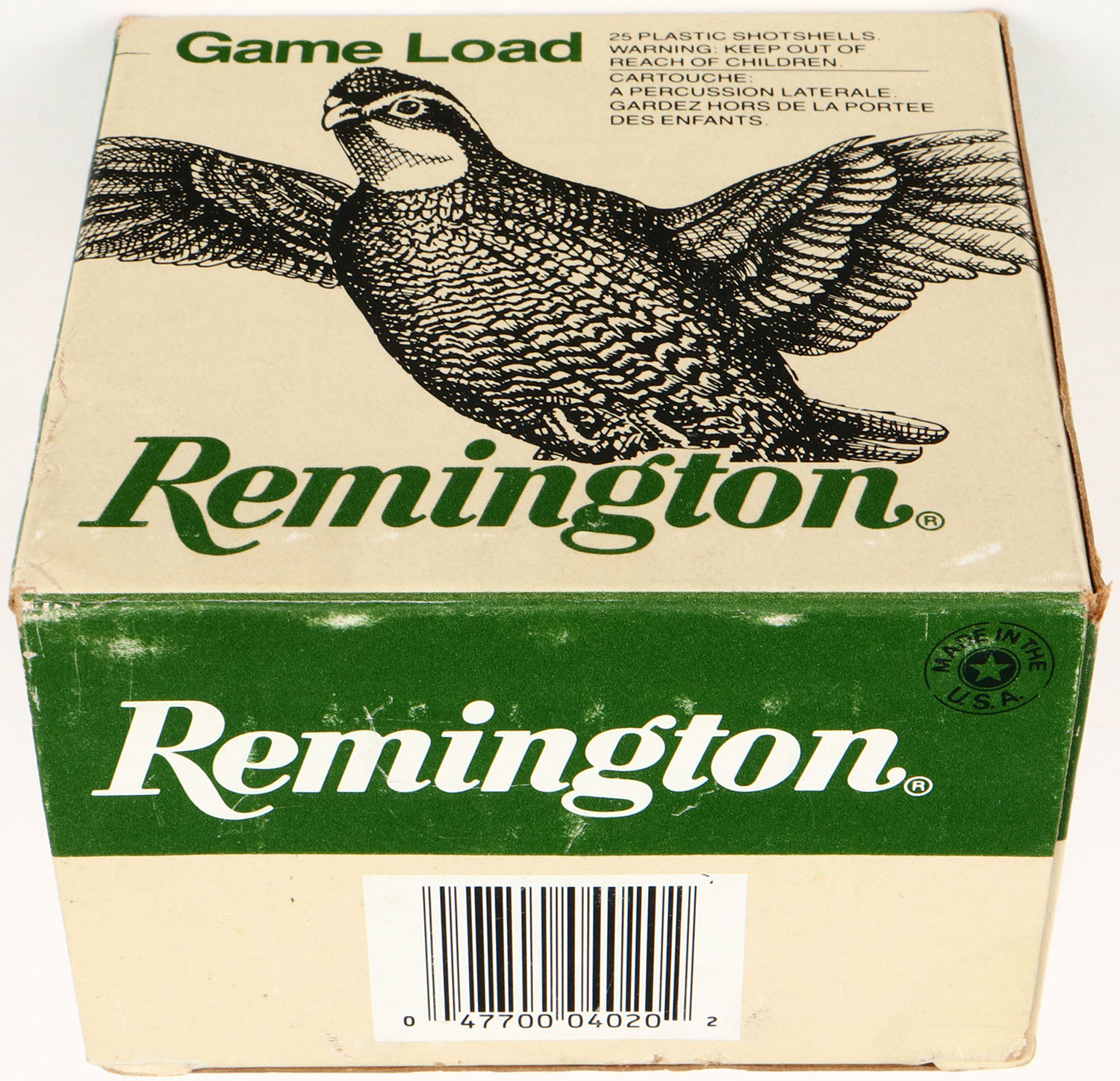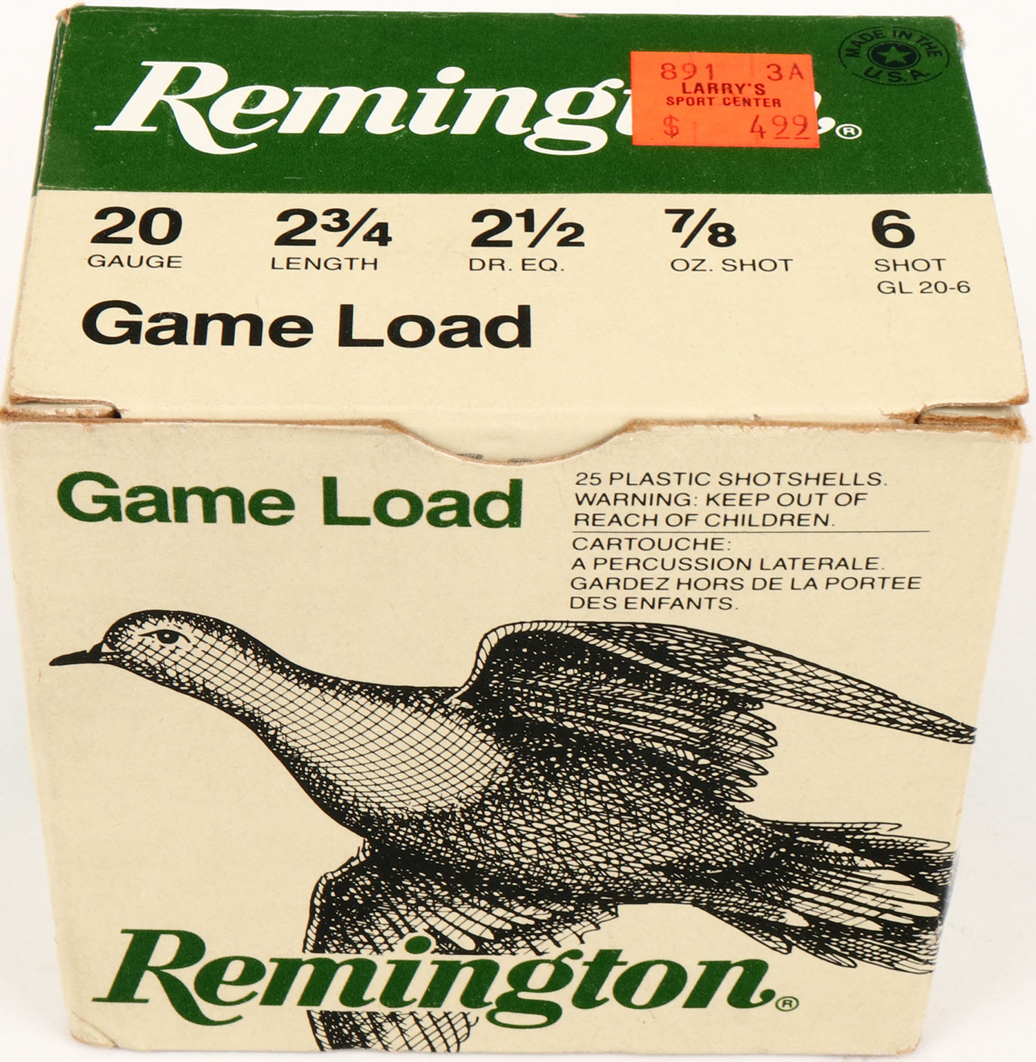Remington, Game Load, 20ga., 2 3/4'', 1pc., Full, shot size 6, green, black & gray box, box has great color, shells are excellent. Grade: Excellent ++ - Value: 8 to 20