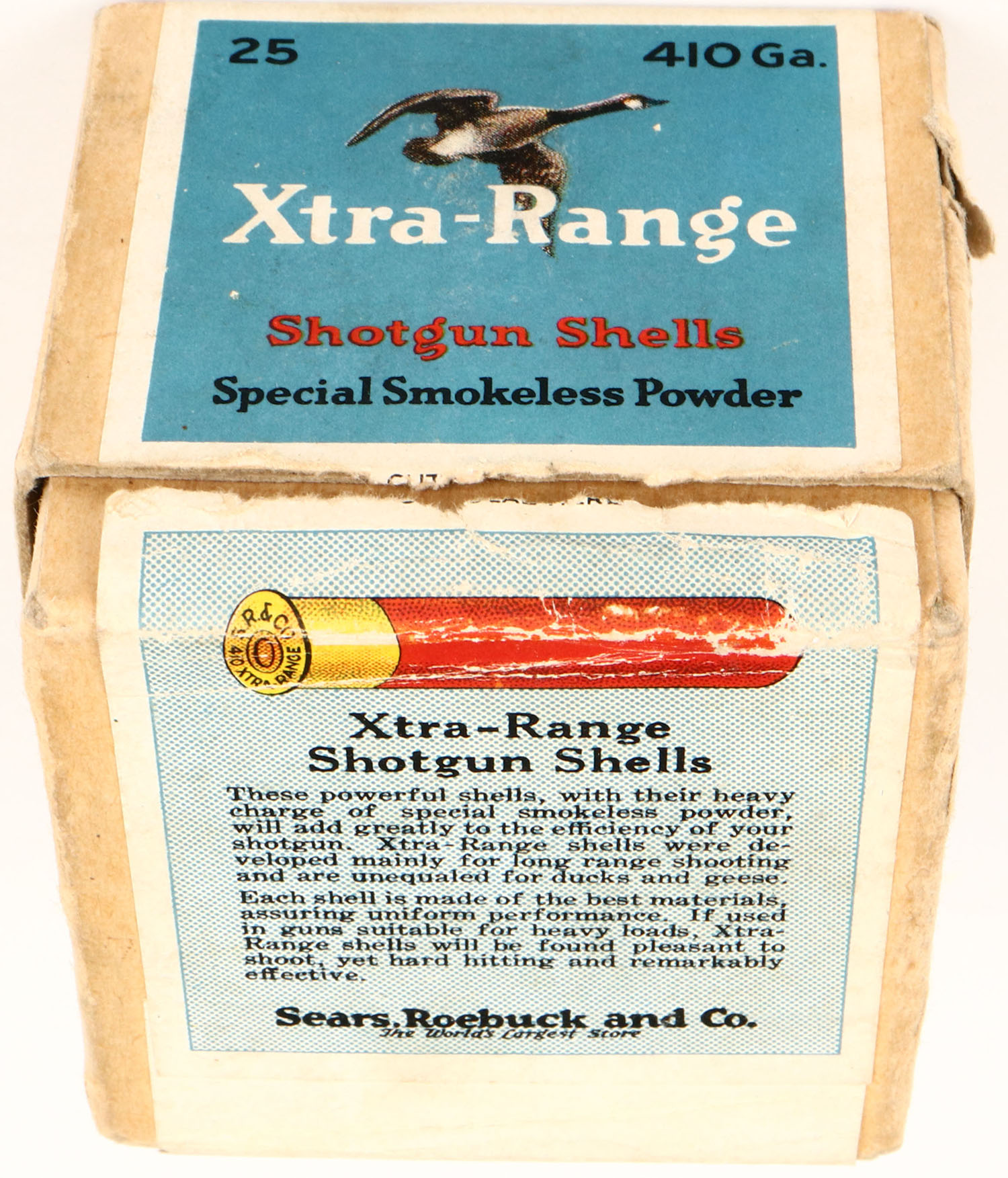 Sears Roebuck and Co., XTRA-RANGE, 410ga., 2pc., Full of random shot size with seven being correct, shot size 5 Chilled Shot, buff box with multi colored label that pictures a Goose flying, with little edge wear, shells are excellent. Grade: Excellent - Value: 100 to 250