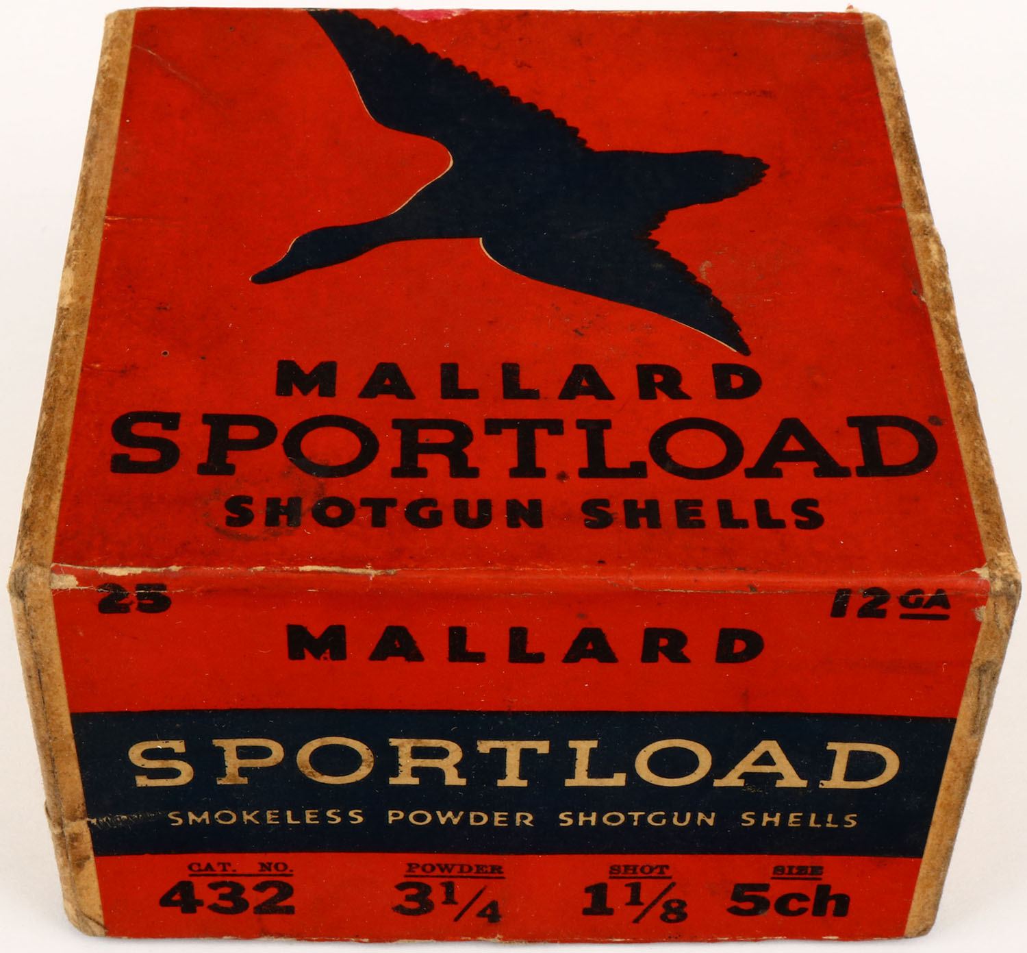 Sears, Sportload MALLARD, 12ga., 2pc., Empty, shot size 5ch, red & blue box that pictures a Mallard in flight, box is very solid with nice color has light age soiling. Grade: Very Good ++ - Value: 40 to 100