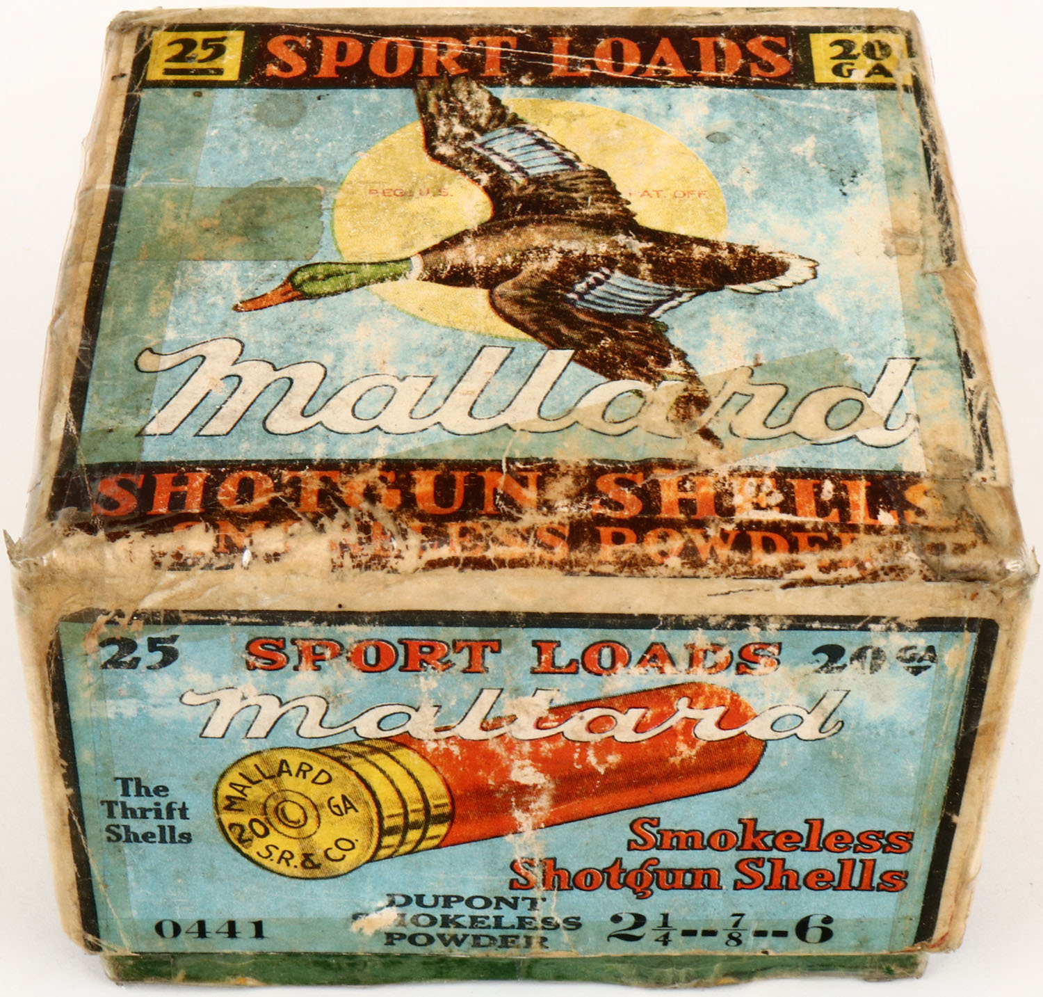 Sears, Sports Loads MALLARD, 20ga., 2pc., Partial 18rds all are incorrect brand, shot size 6, buff box with multi colored label that pictures a Mallard flying with a yellow moon in background, box has incorrect bottom box with tape repair, age soiling & nice colors, shells are very good. Grade: Very Good - Value: 20 to 40