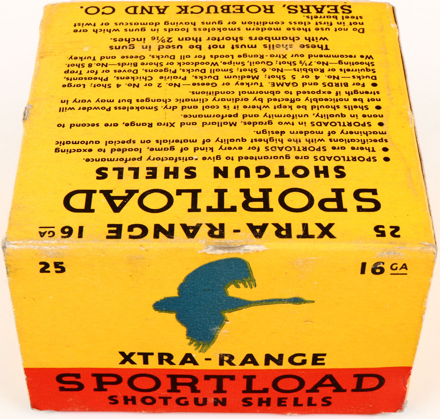 Sears, Sportload XTRA-RANGE, 16ga., 1pc., Full, shot size 7 1/2, yellow, red & blue box that pictures a Goose in flight, box has light edge wear, & great color. Shells are excellent. Grade: Excellent + - Value: 30 to 100