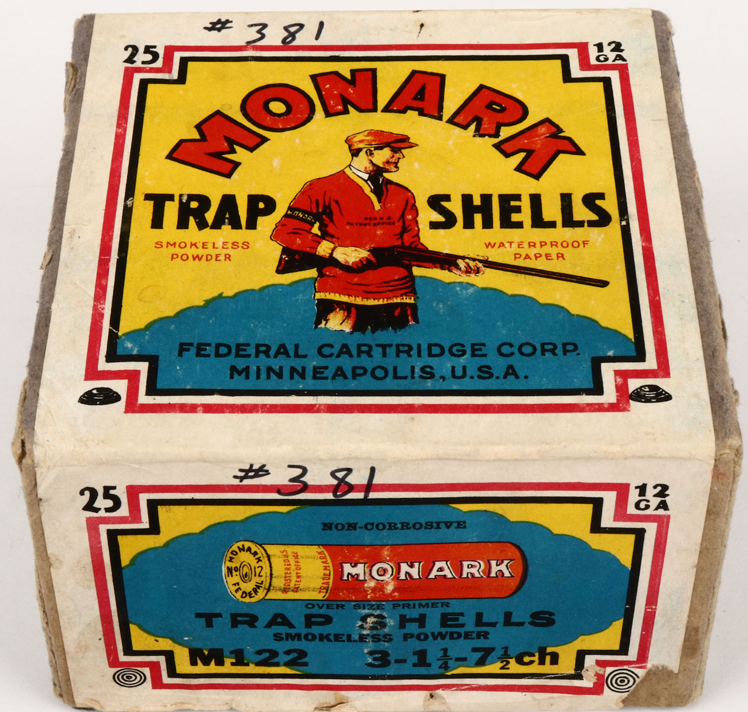 Federal, MONARK TRAP SHELLS, 12ga., 2pc., Empty, shot size 7 1/2ch, blue box with yellow, orange, red & black label, box has shell protrusions, seam splits with very nice label, RARE BOX, Grade: Very Good ++ - Value: 100 to 500