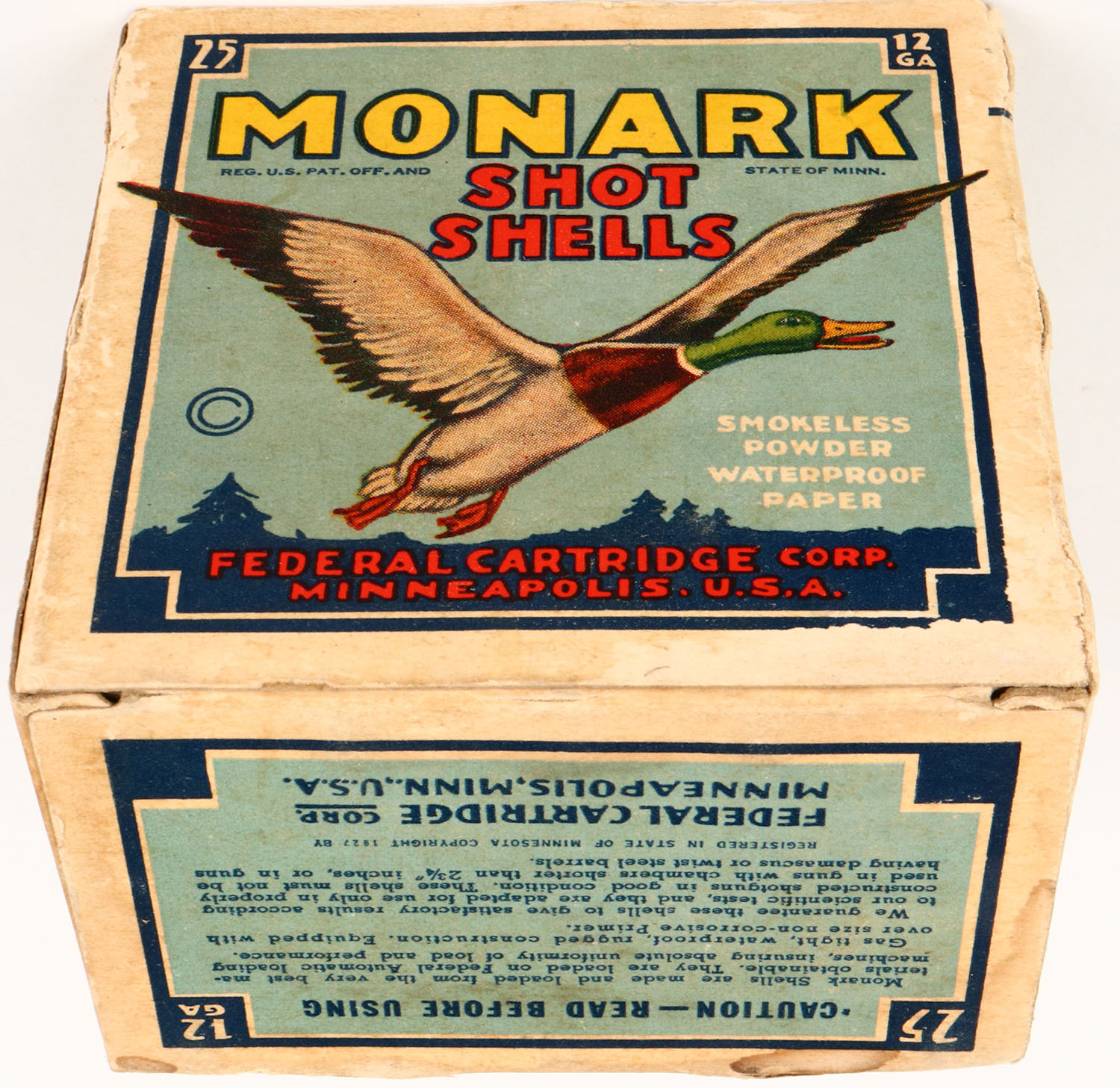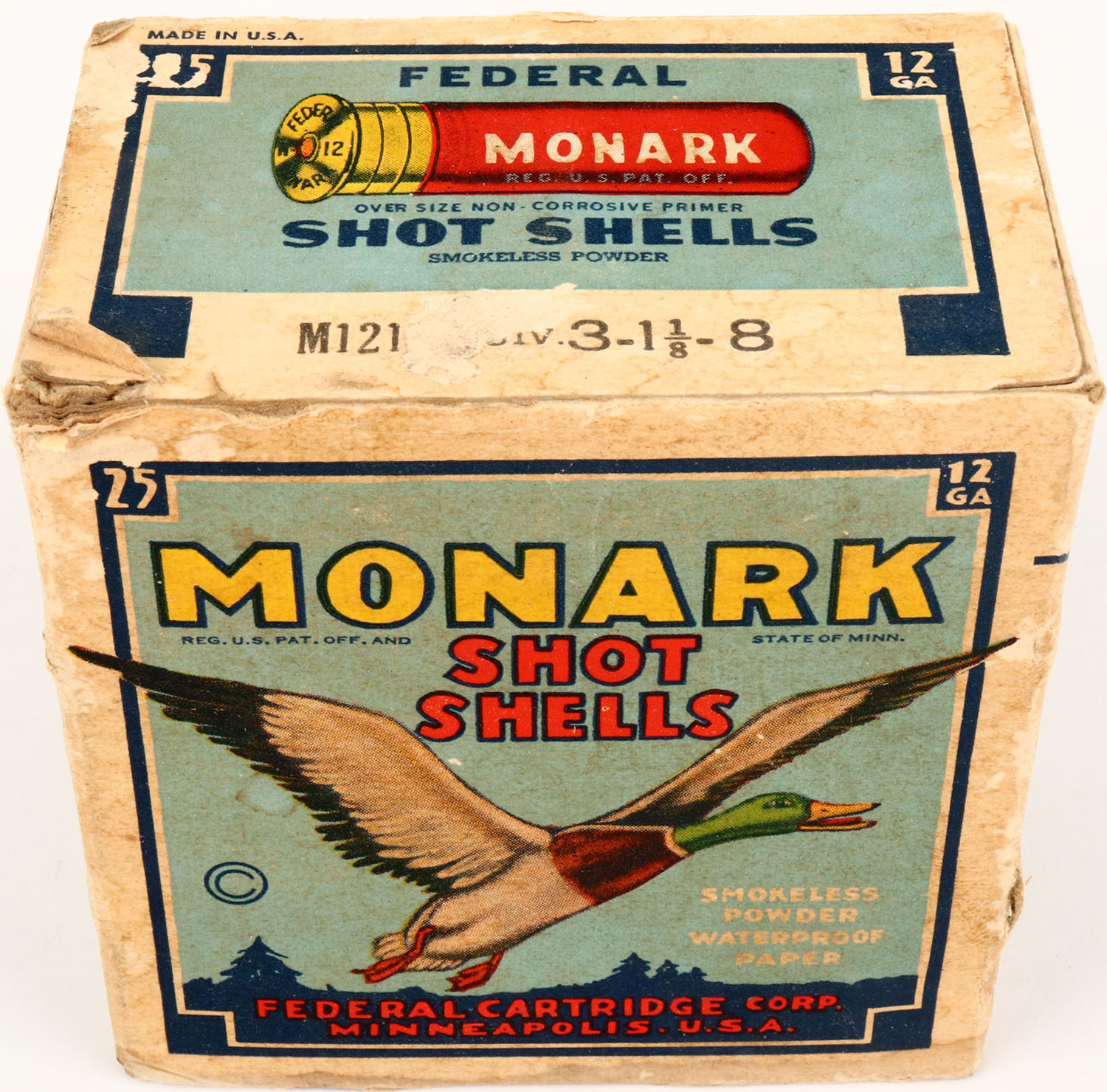 Federal Cart. Co., MONARK, 12ga., 1pc., Full, shot size 8, Blue border, black, yellow and red box with flying mallard, box has scuffing, shell protrusions, light age soiling & is solid with nice color, shells are excellent. Grade: Excellent - Value: 16 to 40