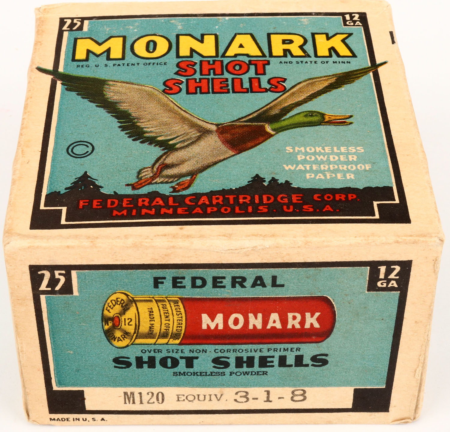 Federal Cart. Co., MONARK, 12ga., 1pc., Full, shot size 8, Black border, blue, yellow and red box with flying mallard, box is solid with great color, shells are very good. Grade: Excellent - Value: 16 to 40