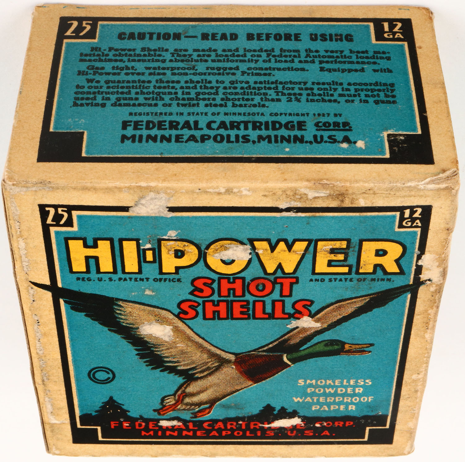 Federal Cart. Co., HI-POWER with insert, 12ga., 1pc., Full, shot size 2ch, Black border, blue, yellow and red box with flying mallard, box has scuffing with light age soiling is solid with very nice color, shells are very good. Grade: Very Good ++ - Value: 10 to 30
