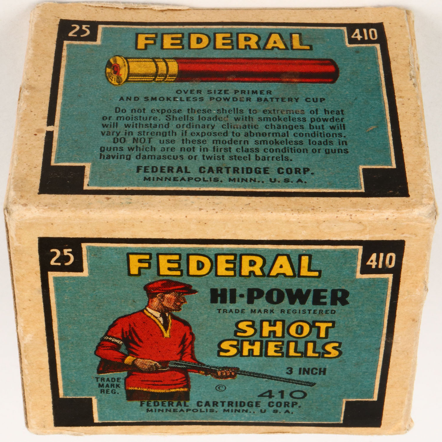 Federal Cart. Co., HI-POWER, 410ga., 1pc., Full, shot size 7 1/2, Black border, blue, yellow and red box that pictures trap shooter with red sweater & cap, box inside flap is torn, has tape repair with great colors, shells are very good. Grade: Excellent - Value: 16 to 60
