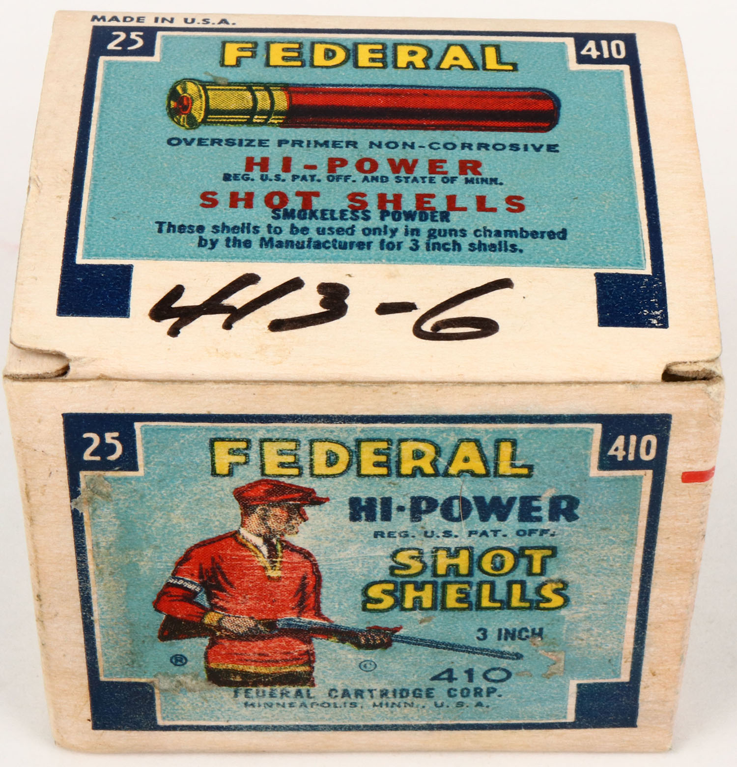 Federal Cart. Co., HI-POWER, 410ga., 1pc., Full, shot size 6, Blue border, black, yellow and red box that pictures trap shooter with red sweater & cap, box has light scuffing is very solid with great colors, shells are excellent. Grade: Excellent - Value: 16 to 60
