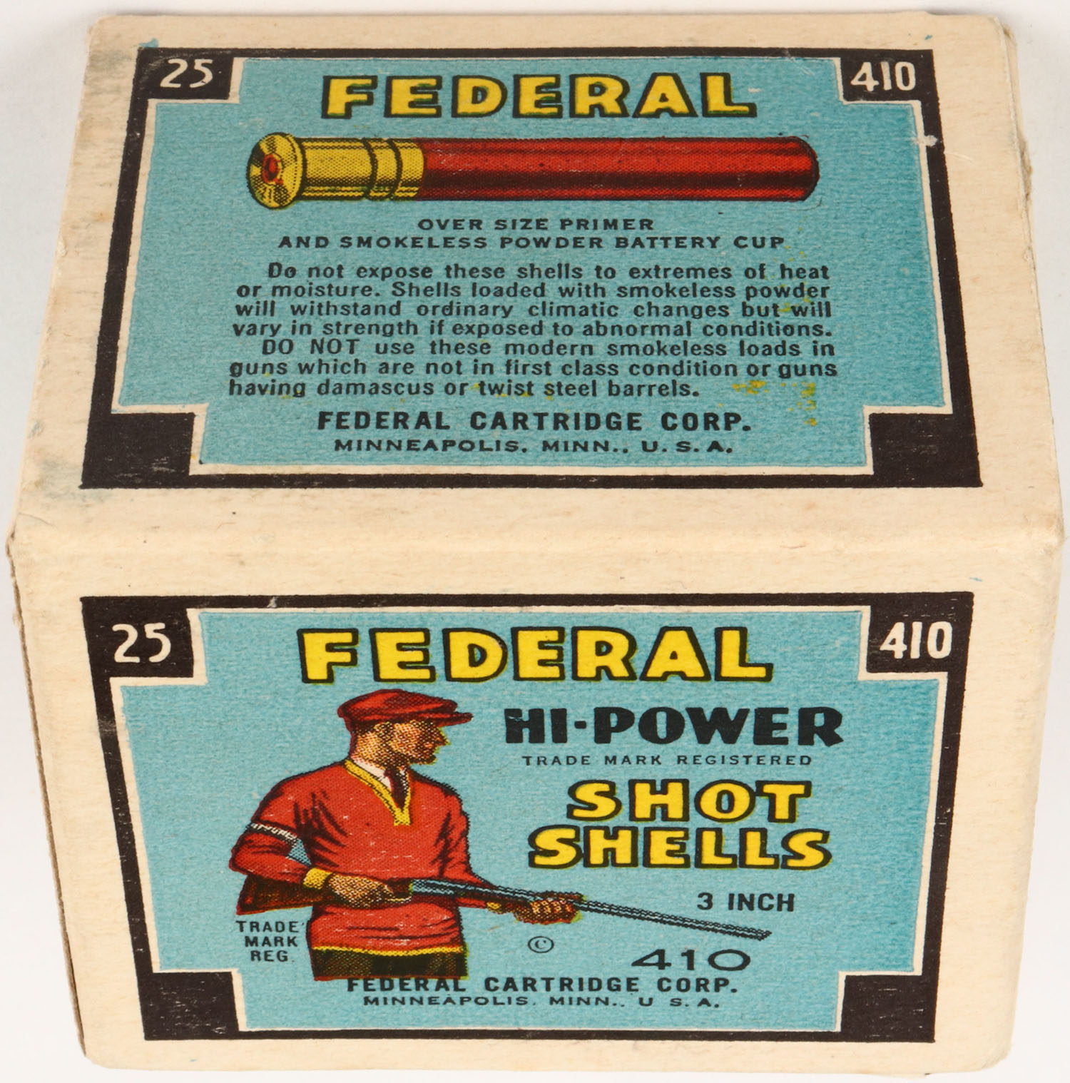 Federal Cart. Co., HI-POWER, 410ga., 1pc., Full, shot size 6, Black border, blue, yellow and red box that pictures trap shooter with red sweater & cap, box is very solid with great colors, shells are very good. Grade: Excellent + - Value: 16 to 60