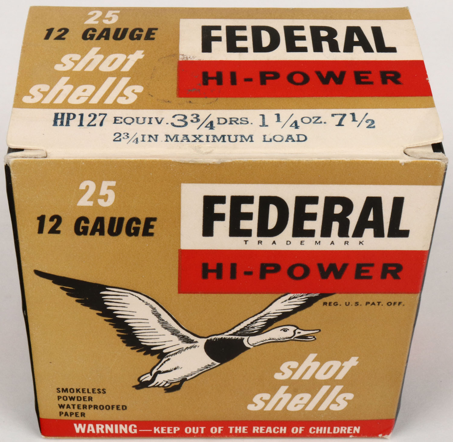 Federal, HI-POWER, 12ga., 1pc., Full, shot size 7 1/2, multi-colored box, box is very solid with great colors, shells are excellent. Grade: Excellent ++ - Value: 8 to 20