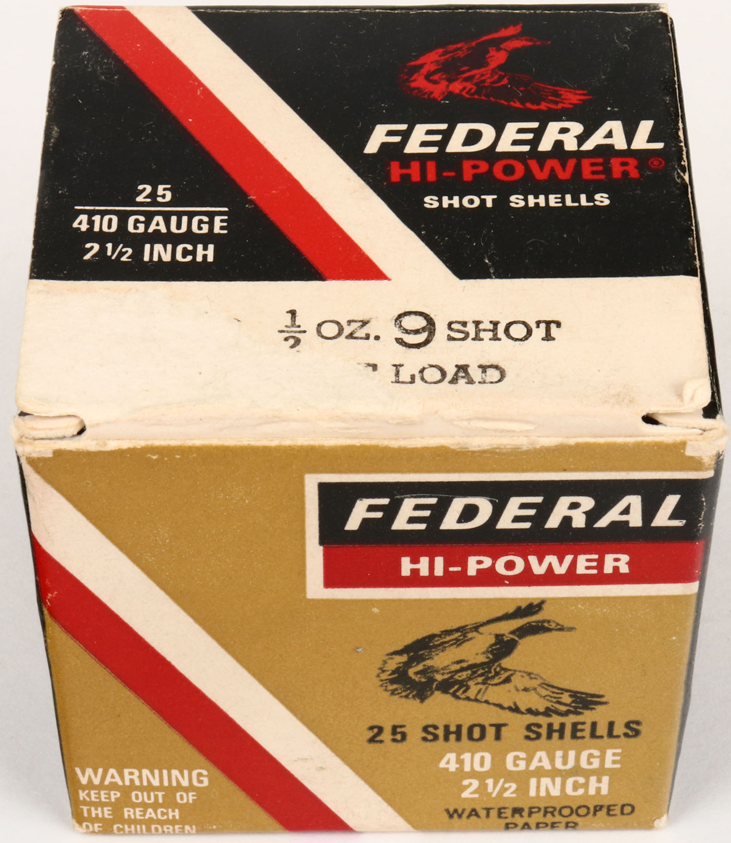 Federal, HI-POWER, 410ga., 1pc., Full, shot size 9 Skeet Load, multi-colored box, box is very solid with very nice colors, shells are excellent. Grade: Excellent ++ - Value: 10 to 30