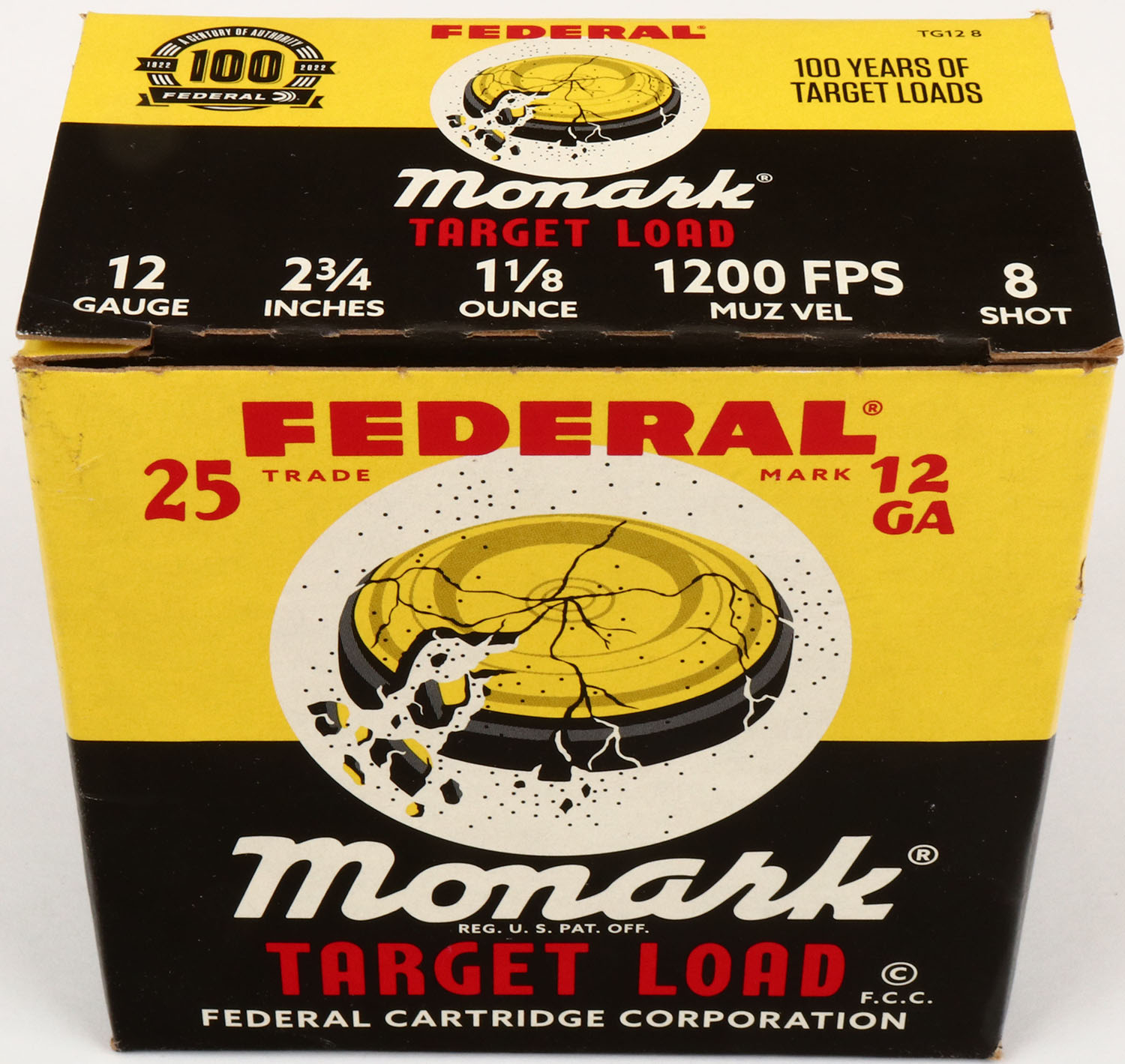 Federal Cart. Co., Monark 100 Year Anniversary, 12ga., 1pc., Full, shot size 8, black, yellow and red box with Trap that has shot all around, box very solid with Minty color box shows earlier boxes and when they were introduced also tells little story about Federal, shells are Minty. Grade: Excellent ++ - Value: 10 to 50
