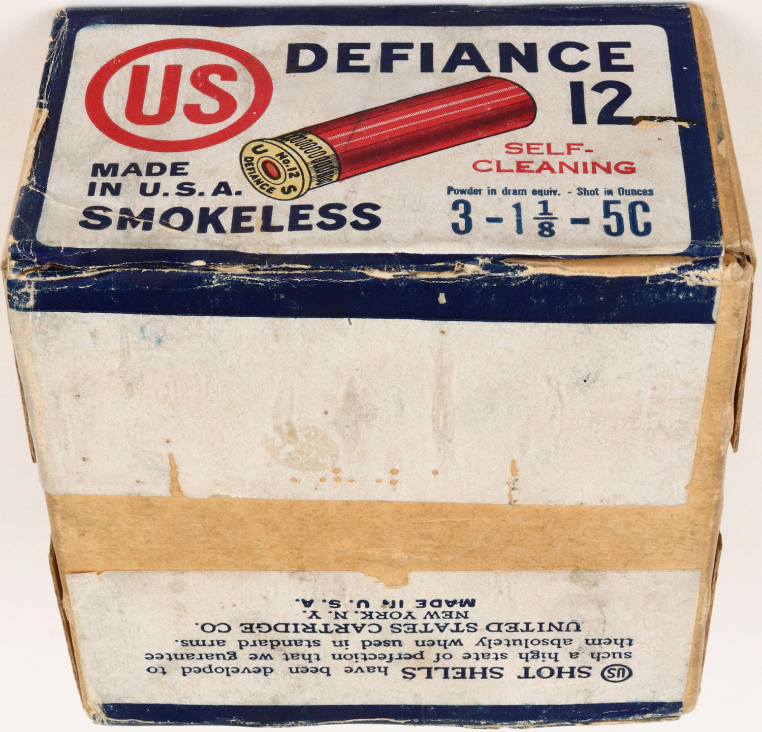 United States Cart. Co., New York, NY, DEFIANCE, 12ga., 2pc., Full, 5C, buff box with white, red & blue label, box is very solid with very nice label and light age soiling, shells are excellent. Grade: Excellent + - Value: 50 to 150