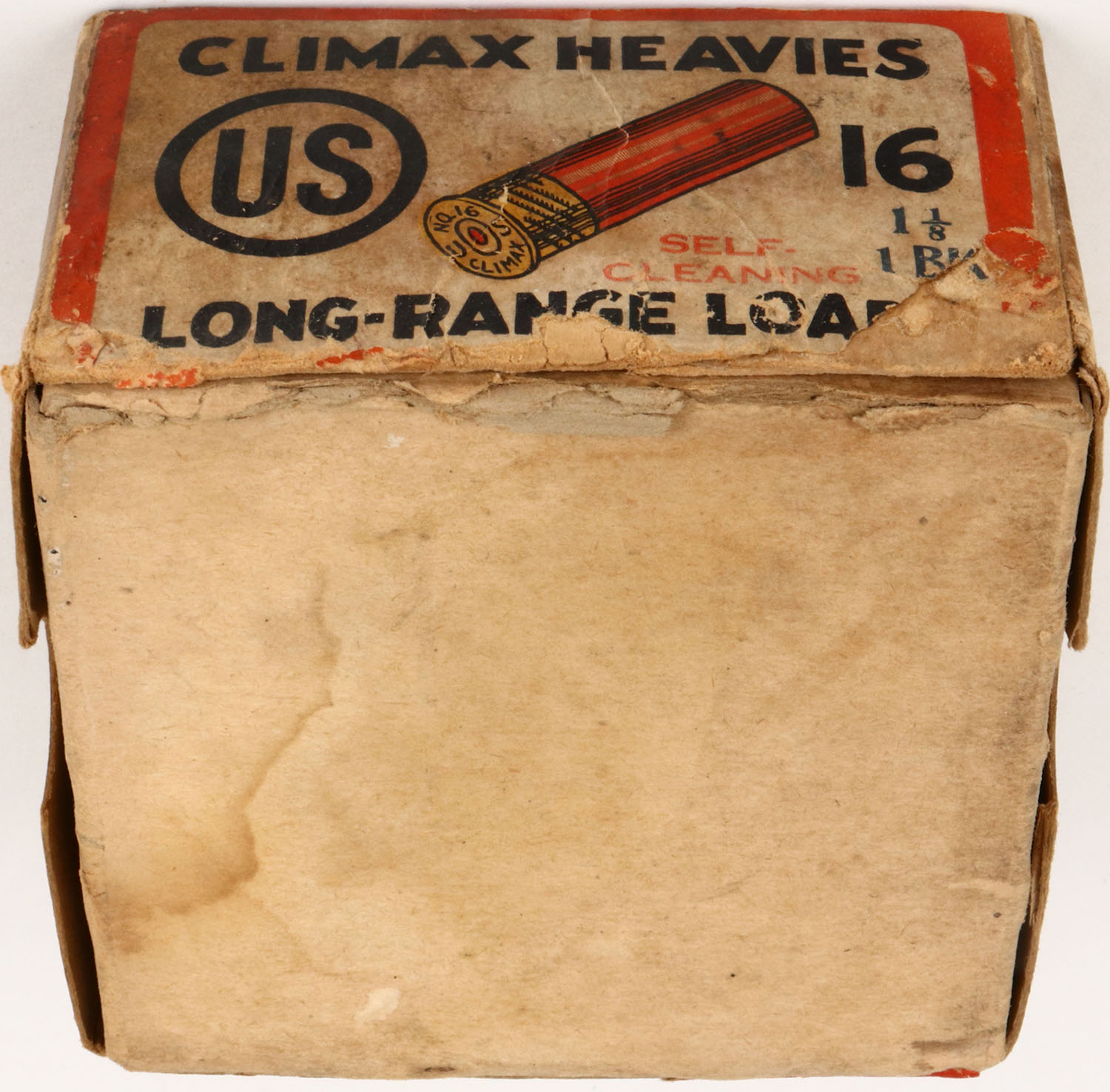U.S. Cart. Co., New York, NY, CLIMAX HEAVIES, 16ga., 2pc., Partial 6rds, shot size 1 Buck, buff box with white, orange & blue paper label, box has seam split, age soiling, Shells are good. Grade: Very Good + - Value: 16 to 50