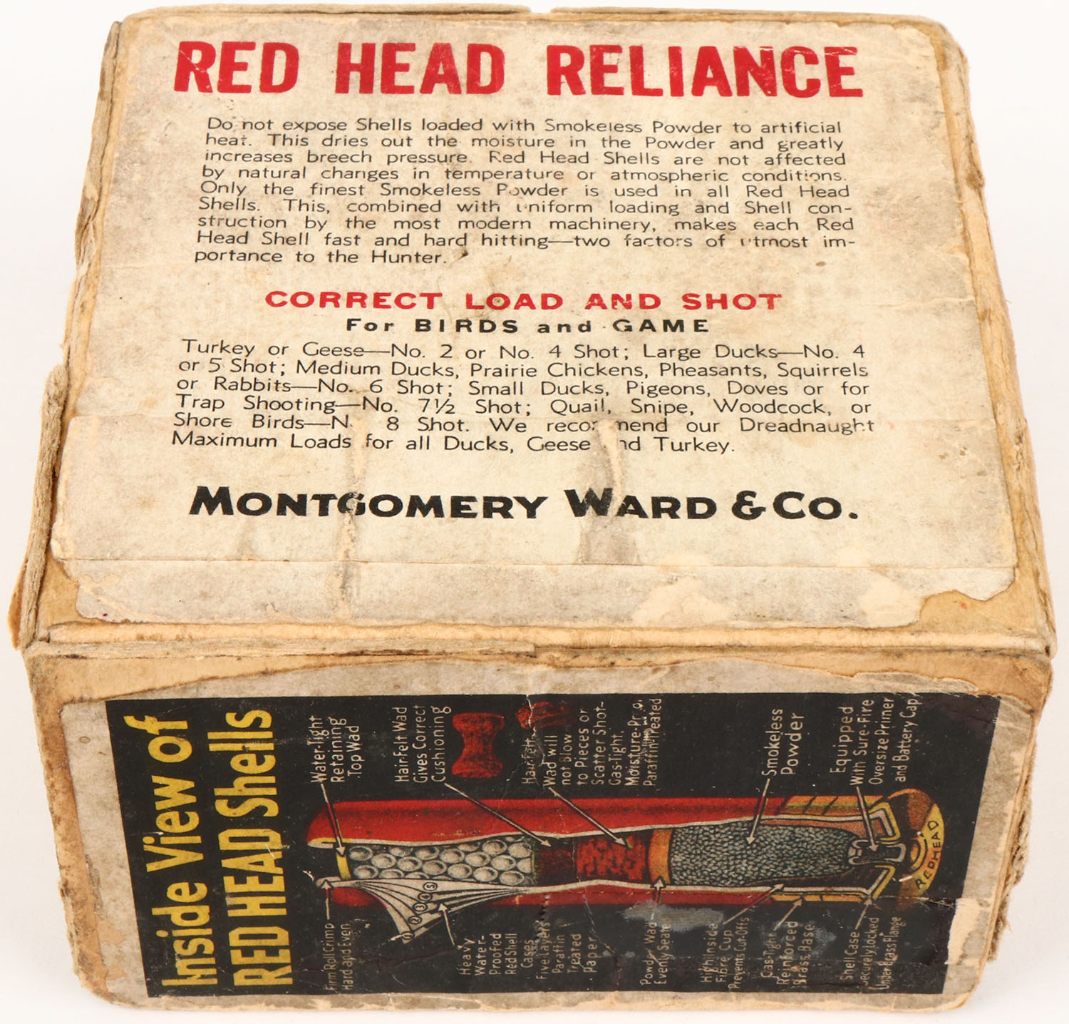 Montgomery Ward & Co., Red Head, Reliance, 12ga., 2pc., Empty, 4 shot, buff box with multi colored scene & single goose flying, box has edge wear, tape repairs, age soiling, some scuffing. Box has tears on right side of box. Grade: Very Good + - Value: 70 to 200