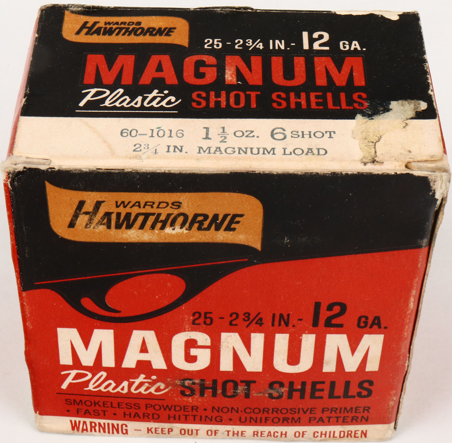 Montgomery Ward Hawthorne, 12ga., 1pc., Full, shot size 6, box is solid with very nice colors, edge wear, shells are very good. Grade: Excellent + - Value: 10 to 30