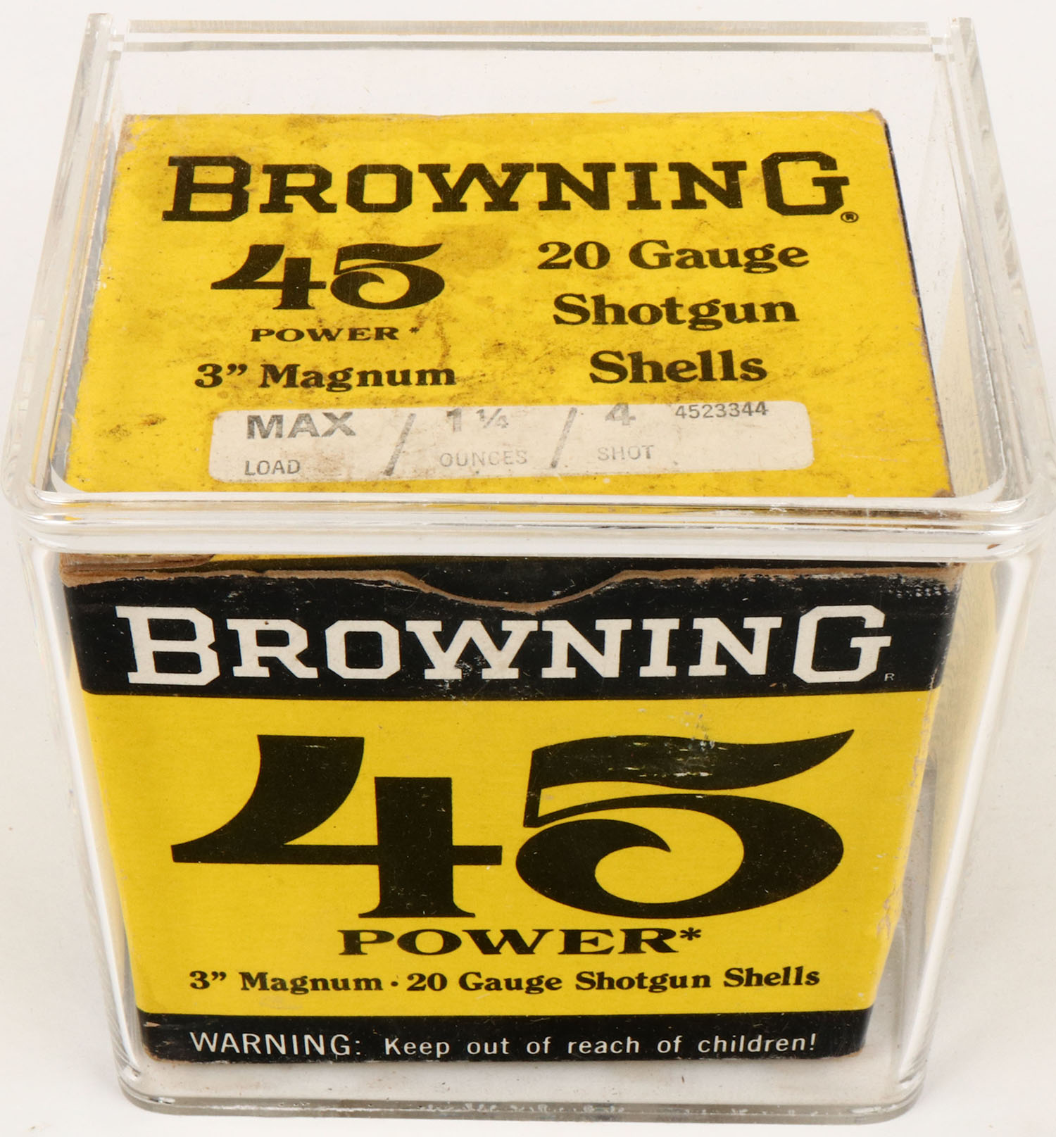 Browning, 45 Power with acrylic box, 20ga., 1pc., FULL, shot size 4, 3 Magnum'', black, yellow & white box, box is solid with nice color, shells are good. Grade: Excellent - Value: 20 to 60