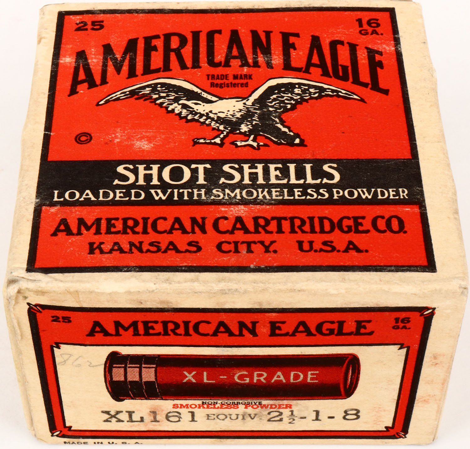 American Cart. Co., XL-Grade, 16ga., 1pc., Full, shot size 8, buff, red & black box that pictures a flying eagle, box has light soiling, mild scuffing, very nice colors, shells are excellent. Grade: Excellent - Value: 30 to 150