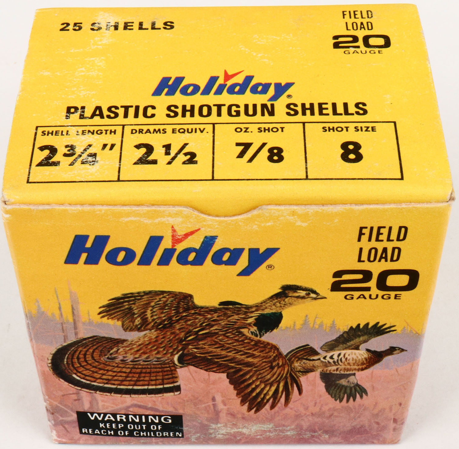 Holiday, Grouse/Rabbit Scene, 20ga., 1pc., FULL, 2 3/4'', shot size 8, multi color graphics of Grouse/Rabbit by Les Kouba, box is solid with excellent colors, Shells are very good. Grade: Excellent - Value: 30 to 150