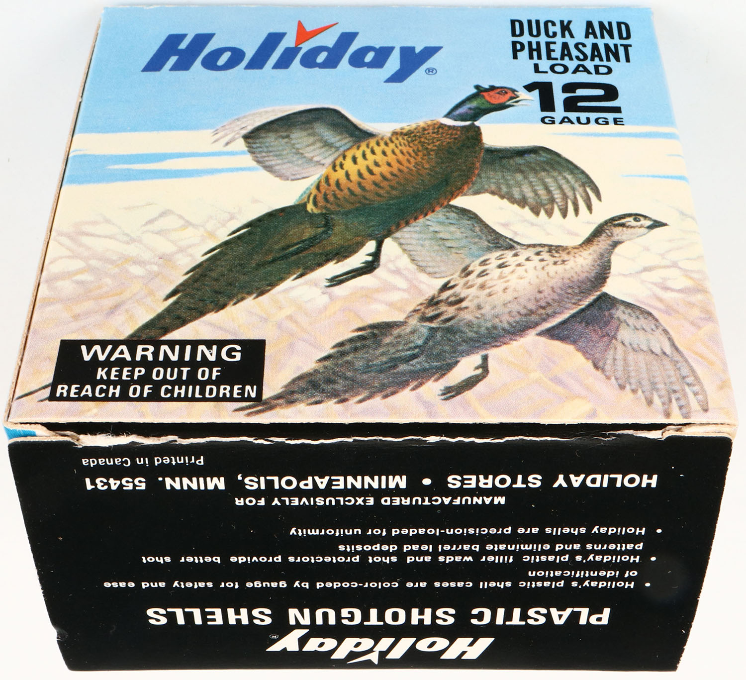 Holiday, Mallards/Pheasants, 12ga, 1pc., Empty, 2 3/4, shot size 4, multi color graphics by Les Kouba, box is very solid with excellent colors. Grade: Excellent + - Value: 20 to 50