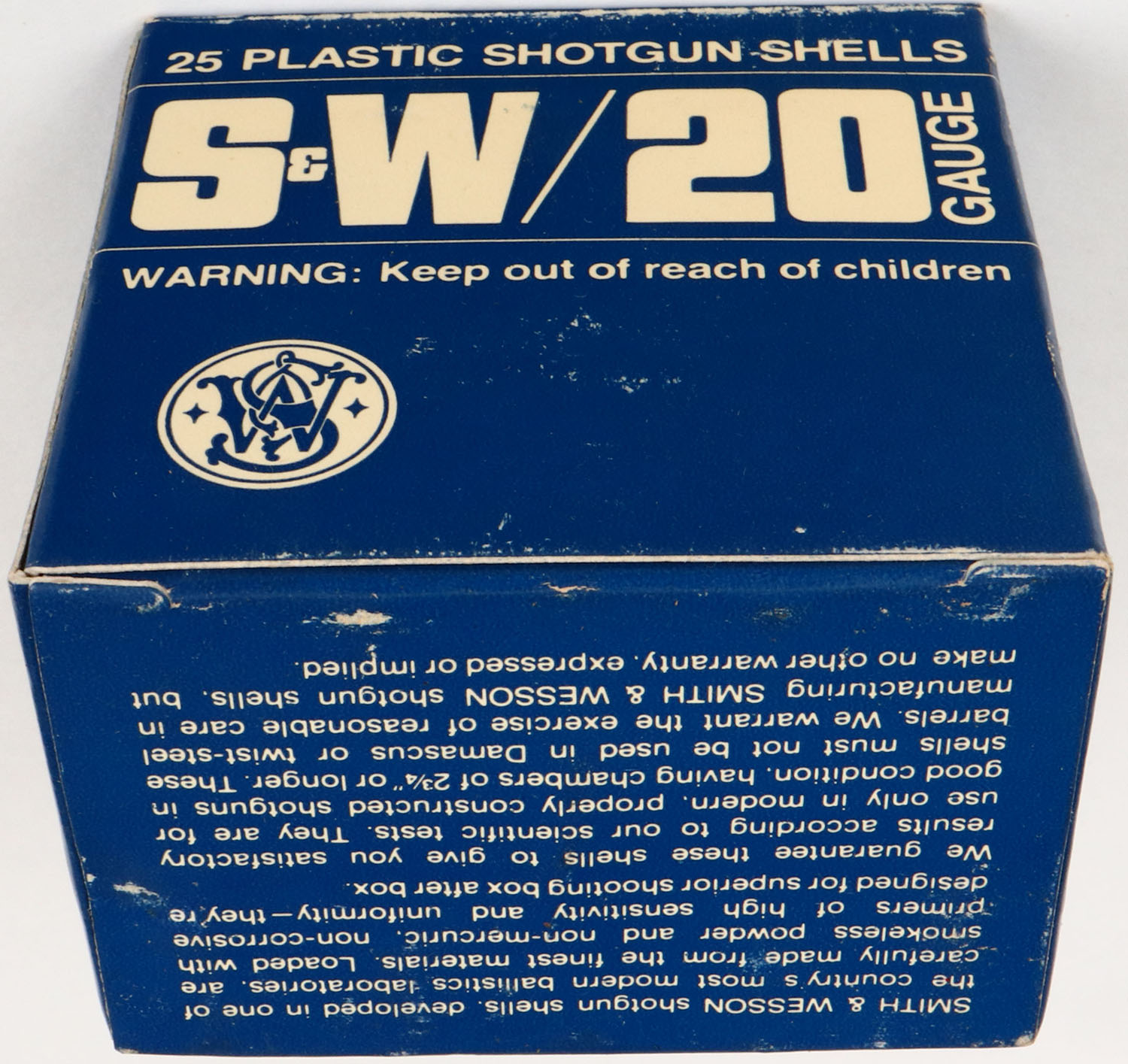 S&W, 20ga., 1pc., FULL, shot size 6 Magnum, box is solid, Shells are excellent. Grade: Excellent + - Value: 8 to 20